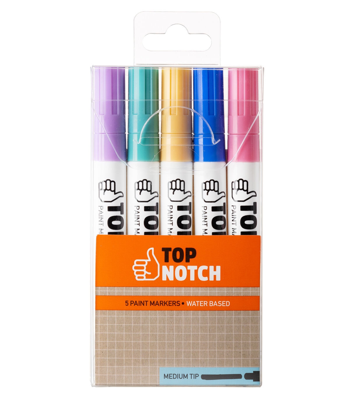 Add a pop of color to your DIY projects with the Top Notch Medium Tip Water Based Paint Markers - Pastel. With a medium tip and fast-drying ink, these paint markers are great for coloring or drawing. Use them to write a motivational phrase on your DIY purse or embellish cork coasters. This pack includes five pastel-hued markers.