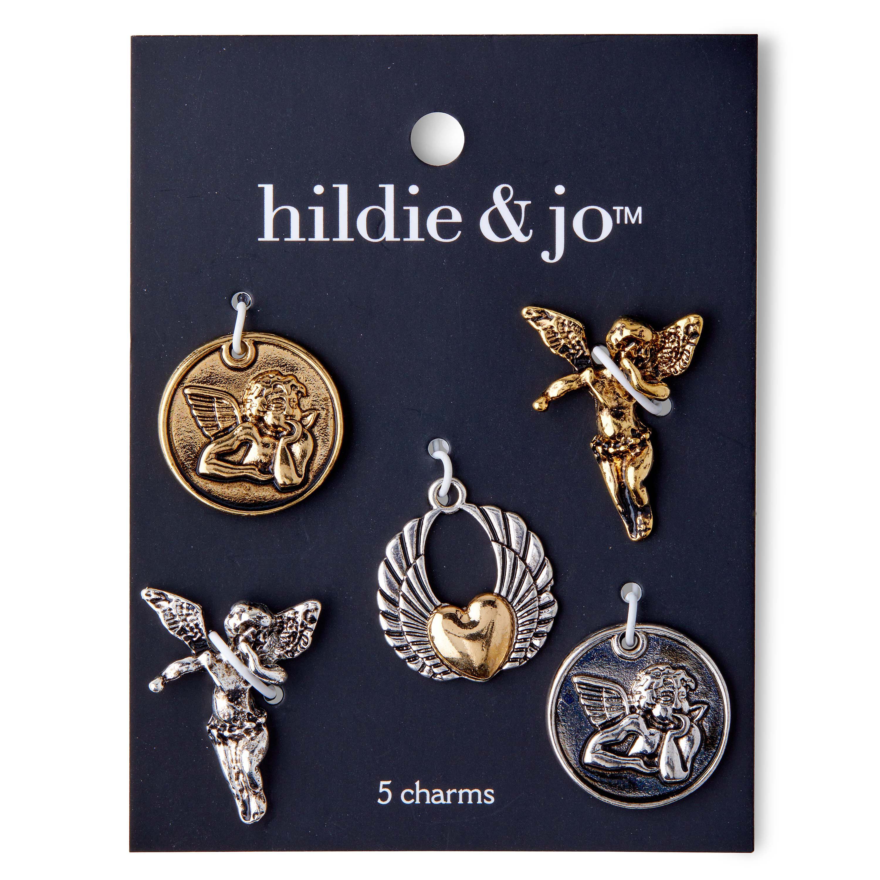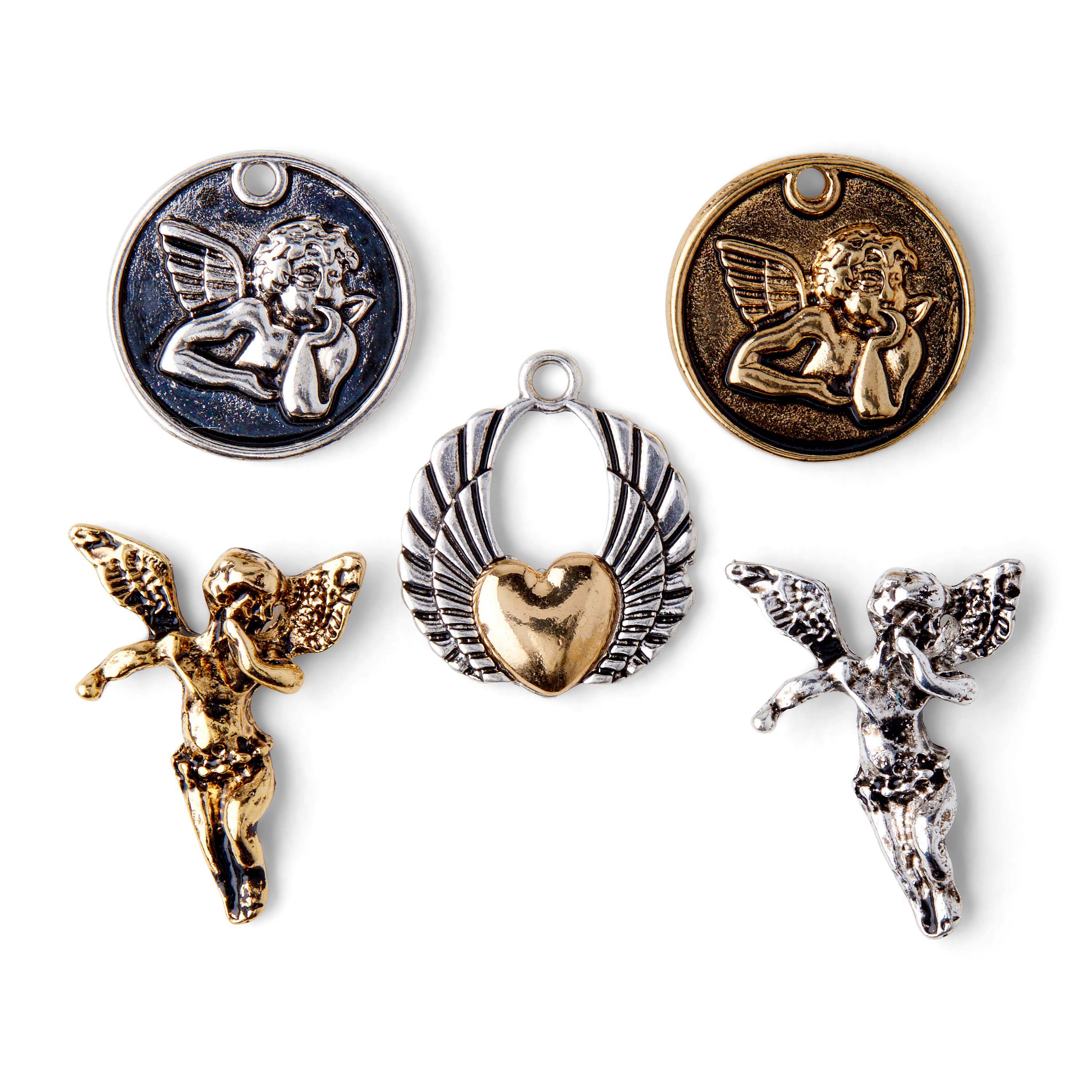 Use the hildie & jo Angel Charms - Silver & Gold in your next DIY jewelry project. This pack comes with six charms. Two of them are coin charms with an embossed image of an angel, the other two are shaped like a flying angel while the third one is shaped like two wings with a heart in the center. Add them to chains, sold separately, and use them to create beautiful necklaces.