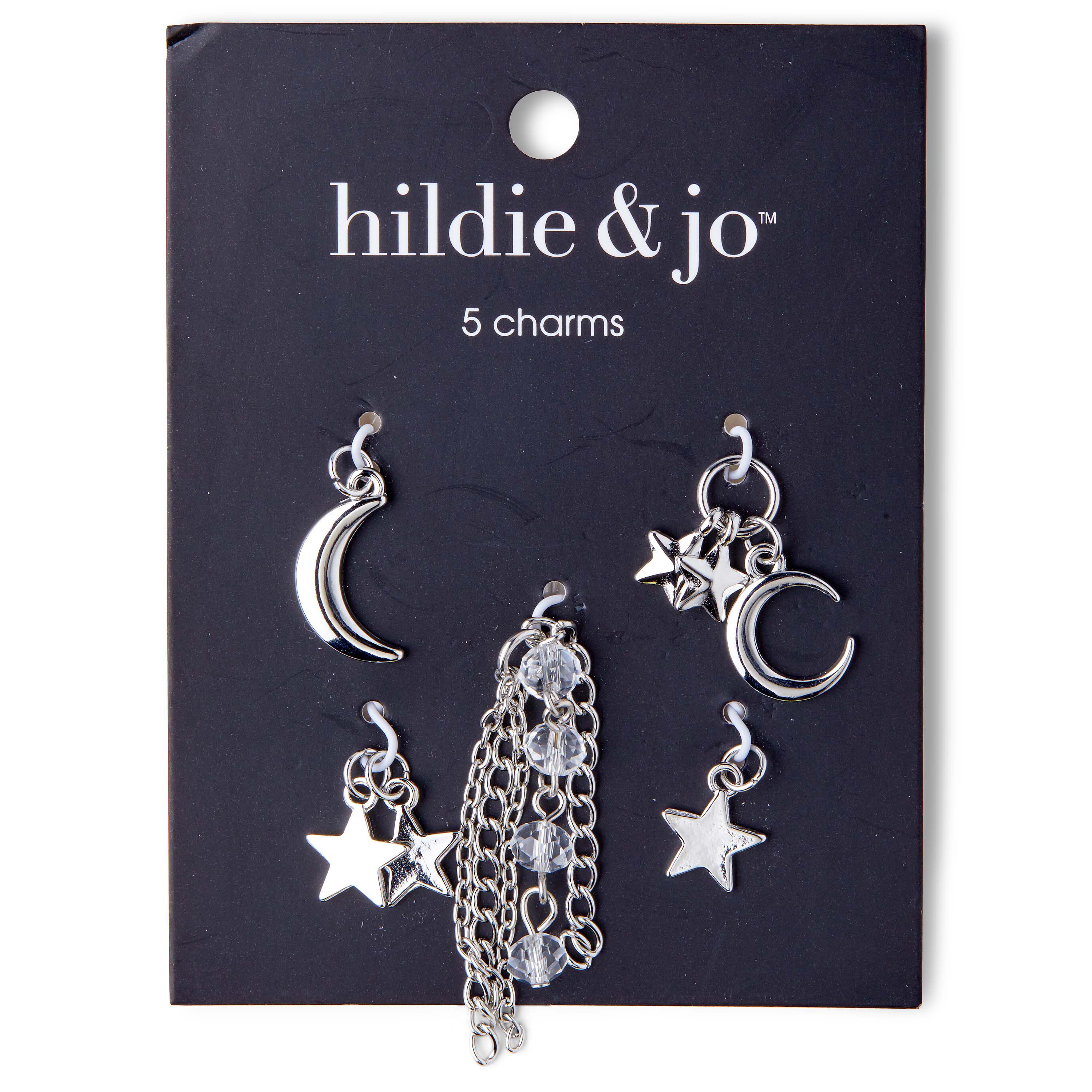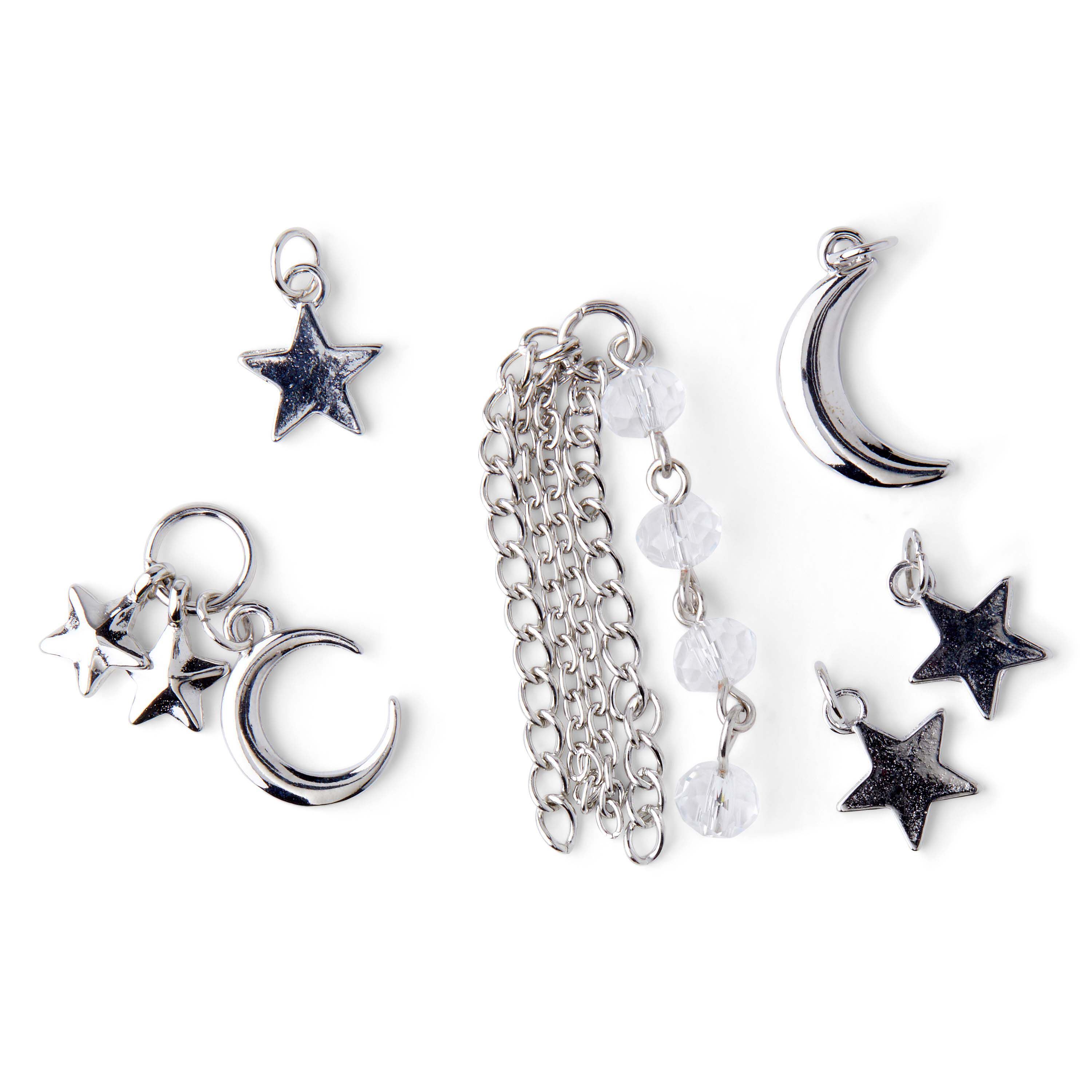 Add these dainty hildie & jo Boulevard Moon & Star Silver Charms to a handmade link bracelet and gift it to your loved one. Designed in smooth silver, the charms include a moon, two five point stars, a moon with two five point stars, a tassel with strands of silver chain and clear beads. The pack includes five charms that you can add them to bracelets, necklaces, keychains and more to create stylish jewelry pieces.