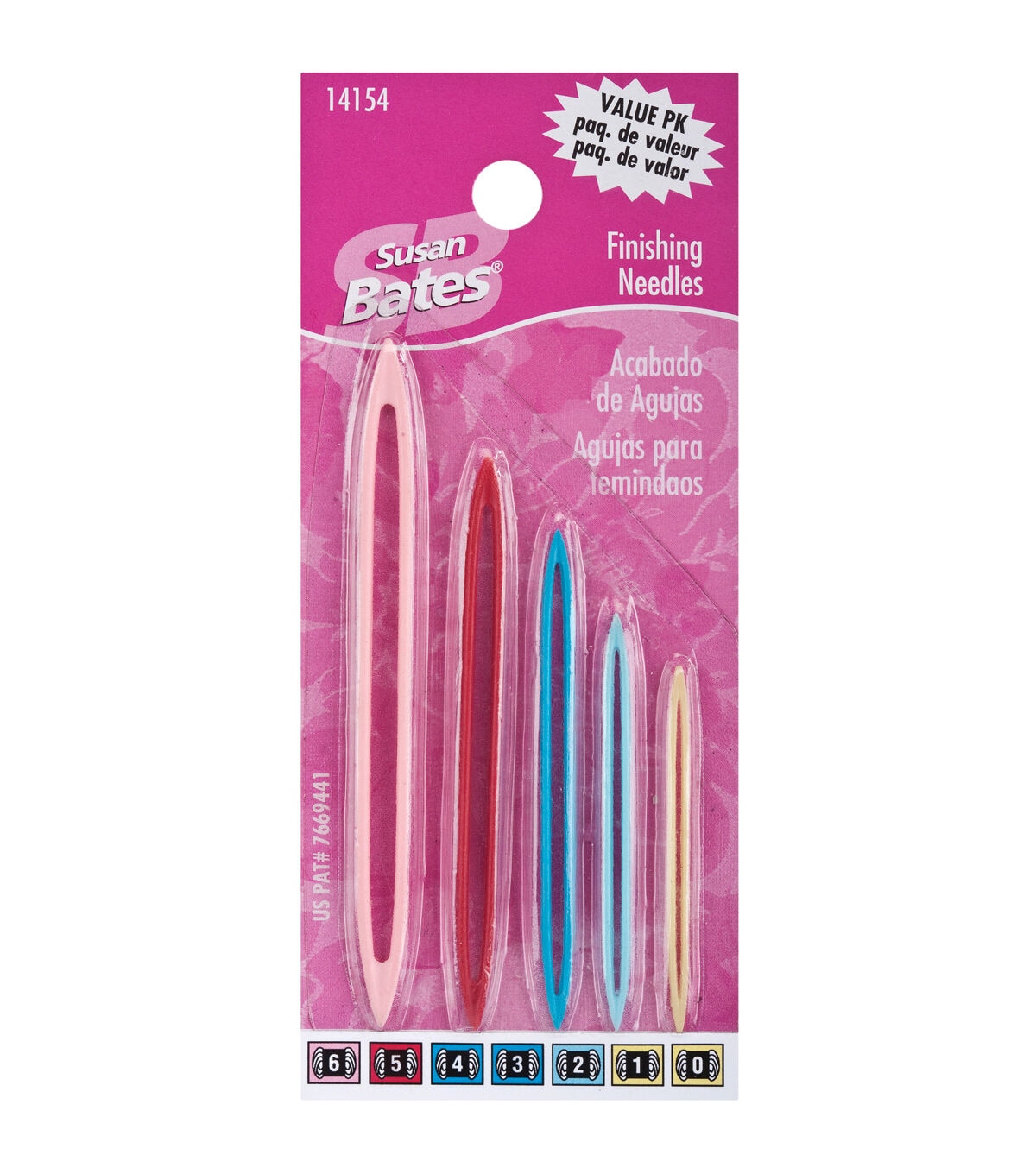 SUSAN BATES-Finishing Needles. These plastic needles are great for finishing up your knit and crochet projects. They range in length from 1-3/4 to 3-1/2 inches and feature an eye that runs the entire length making them much easier to thread and use than traditional needles. This package contains five Finishing Needles for use with all yarn weights. Imported.