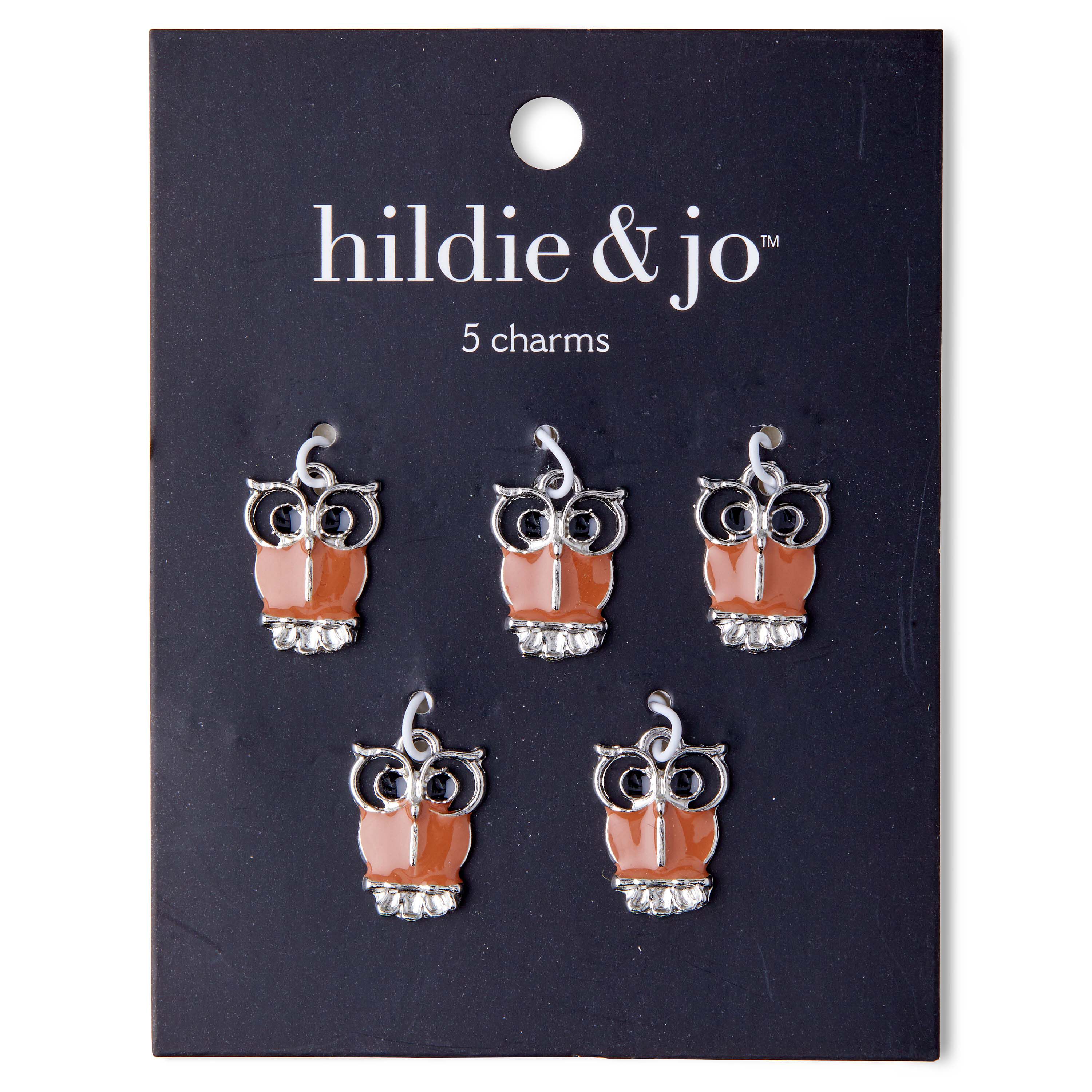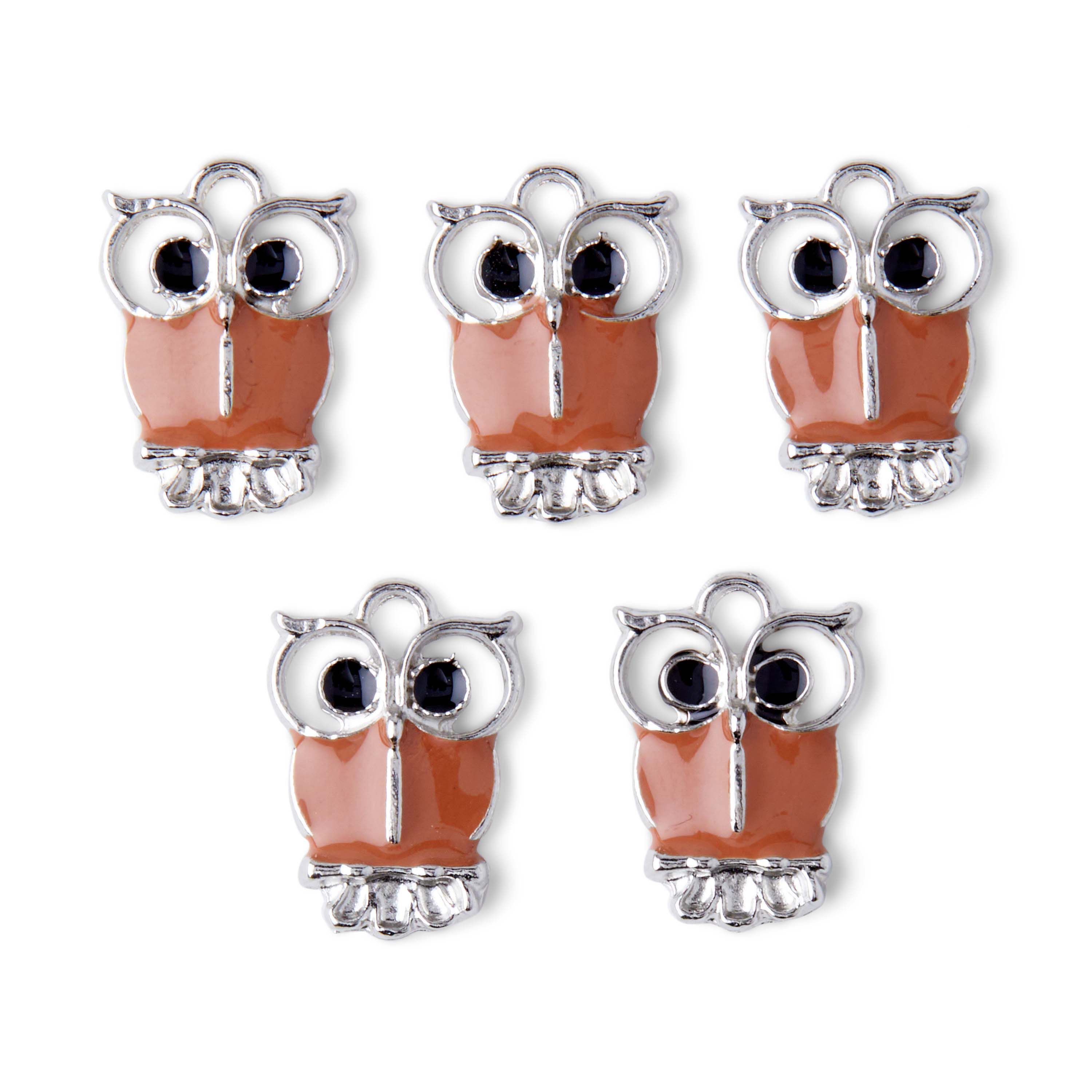 Enliven your jewelry-making projects with these super delightful hildie & jo Symbolize Owl Silver Charms. Adorably aesthetic, these owls are in silver with black eyes and face markings and an orange and silver body. Add them to bracelets, necklaces, keychains and more for visual flair. Each pack contains five owl charms in assorted sizes.