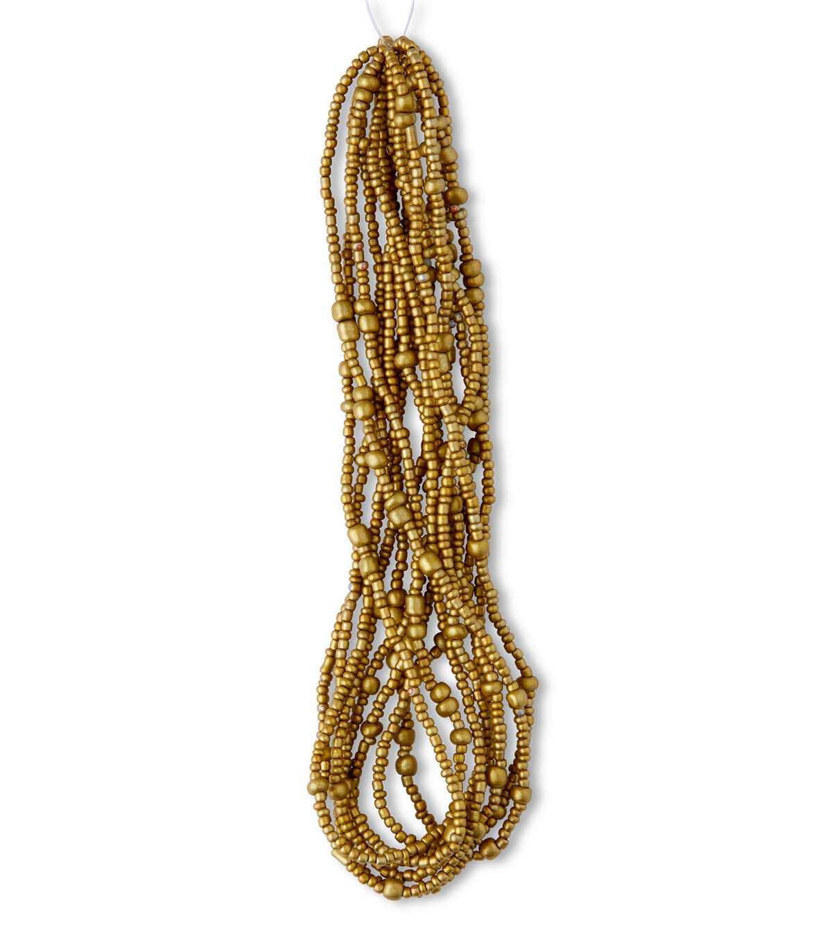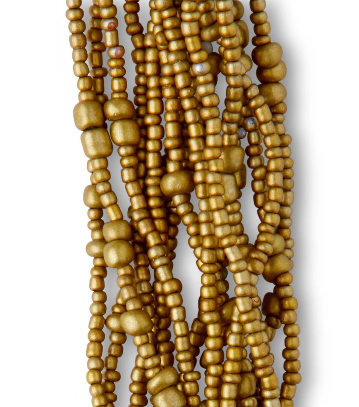 Create unique handcrafted jewelry-making projects with the hildie & jo Glass Seed Bead Strands - Metallic Gold. This pack contains a strand of glass beads sporting a gold tone. Pair them with coordinating beads, cords, chains and more to design beautiful beading projects. You can also use these beads instead of metal spacers to add variety to your designs.