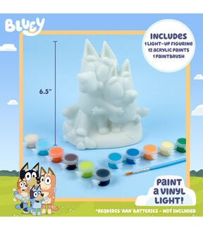 Paint Your Own Bluey Light-Up Figurine and let your imagination shine bright! Explore your creativity as you mix and match tons of paw-some paint colors on a ready-to-paint vinyl Bluey and Bingo figurine. Watch how it comes alive with every stroke! Once your figurine is completely dry, flip it upside-down and insert three “AAA” batteries into the bottom. Then, move the switch to the “ON” position to light up a world of fun, hooray! This light-up figurine measures 5.71” by 5.99”, making it small enough to use as a nightlight or a whimsical décor piece and large enough to inspire storytelling!