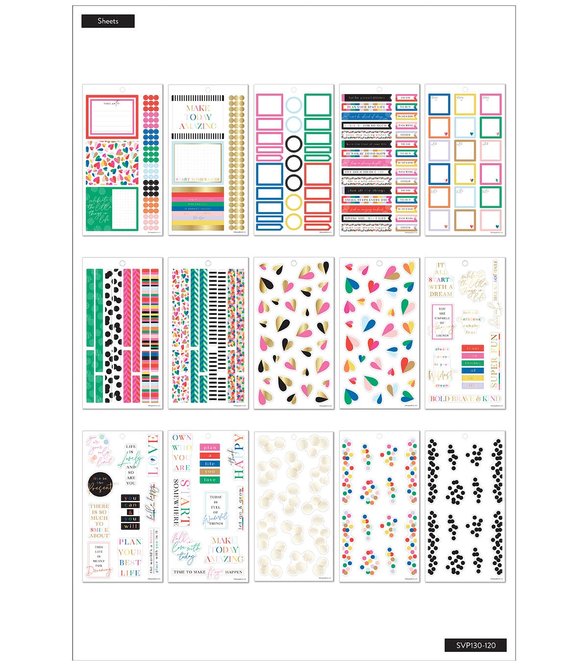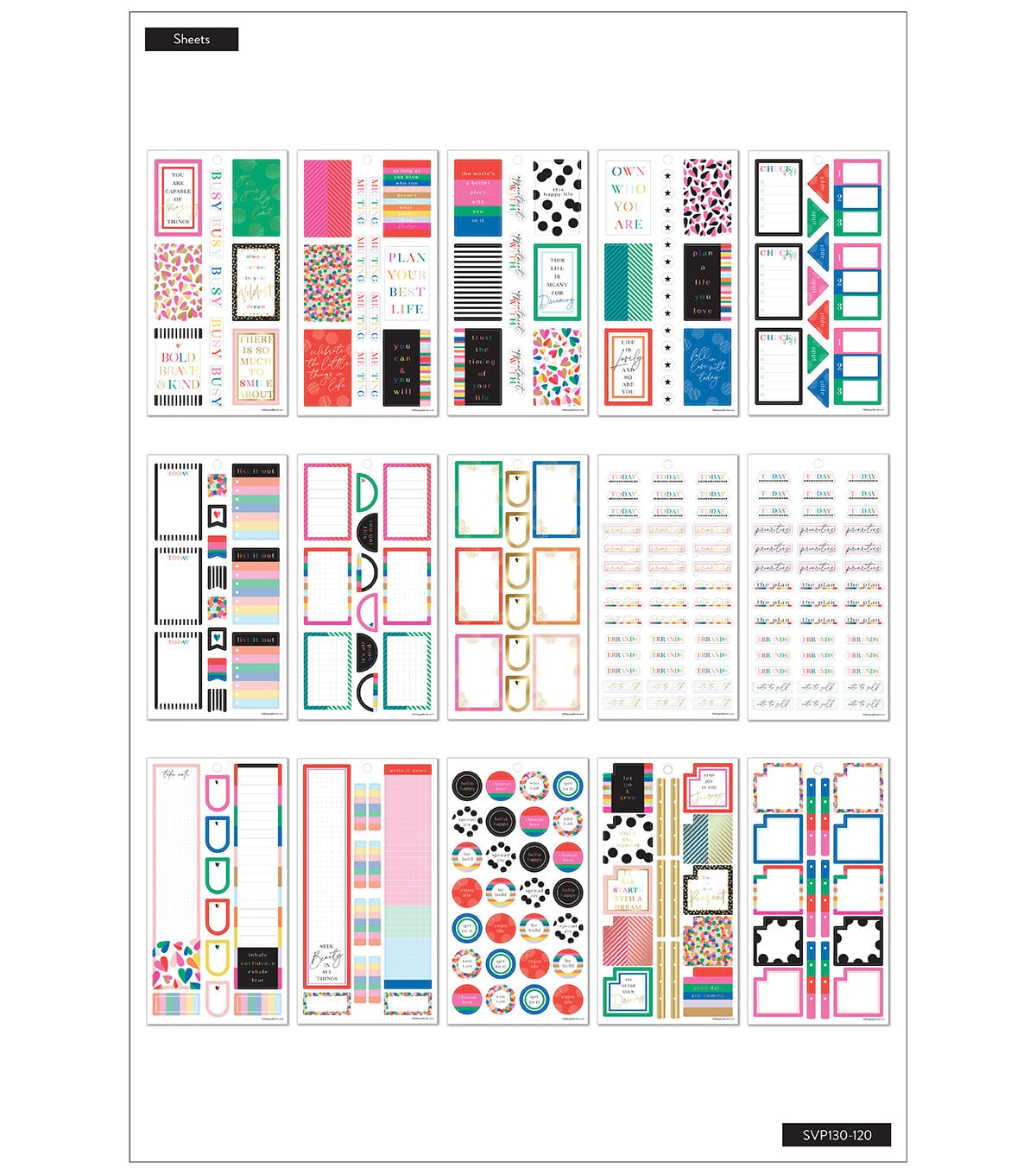 Hello to bright and bold prints! This Value Pack Sticker Book has 30 sheets with 662 stickers. Add these stickers to your Happy Planner! Create colorful spreads with these bold stickers. It’s filled with colorful boxes, fun trims, inspirational quotes, and vibrant designs.