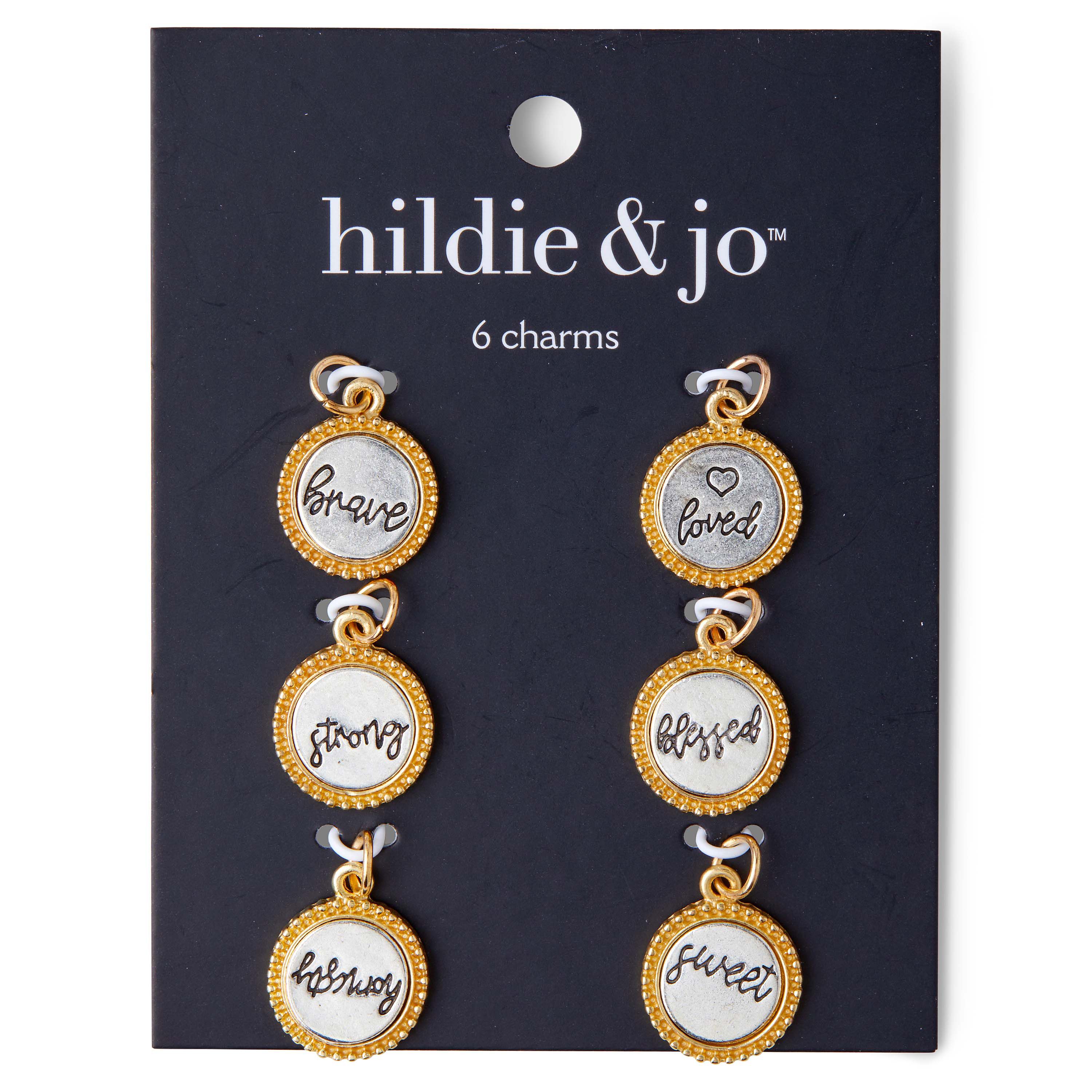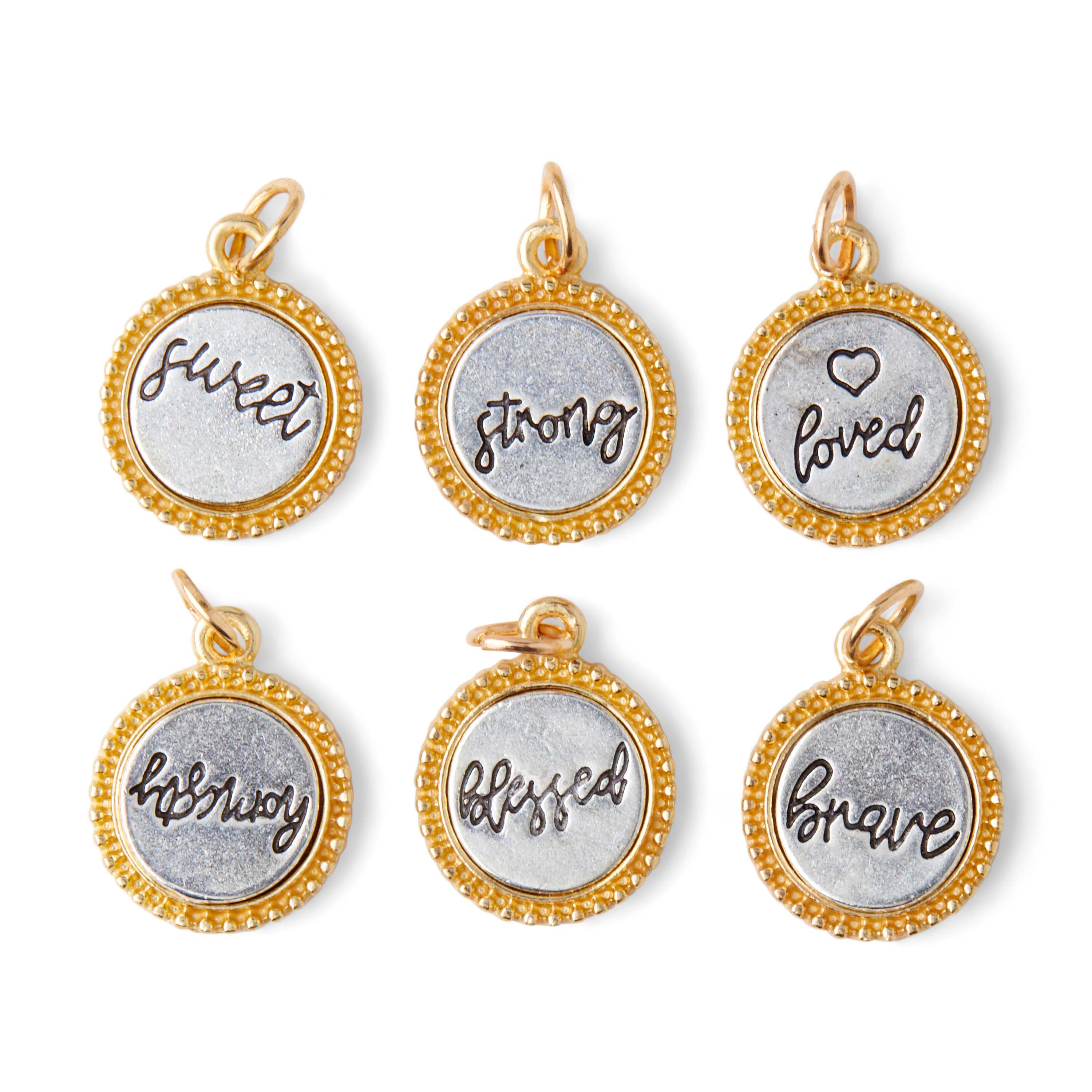 Personalize your DIY jewelry projects with the hildie & jo Double Plating Metal Plate Charms-Word. Featuring a smooth silver-toned finish and engraved with inspiring words like 'Brave', 'Strong', 'Loved', 'Blessed' and more, these charms will make any piece of jewelry special. Use them to decorate bracelets, necklaces, chokers and more.