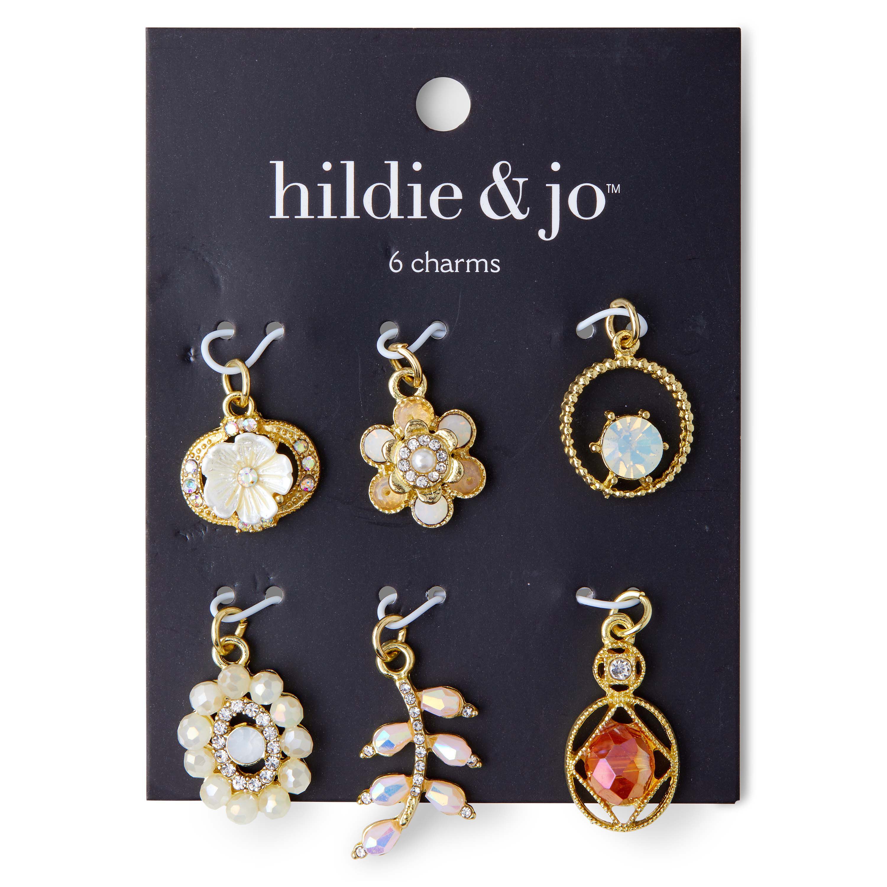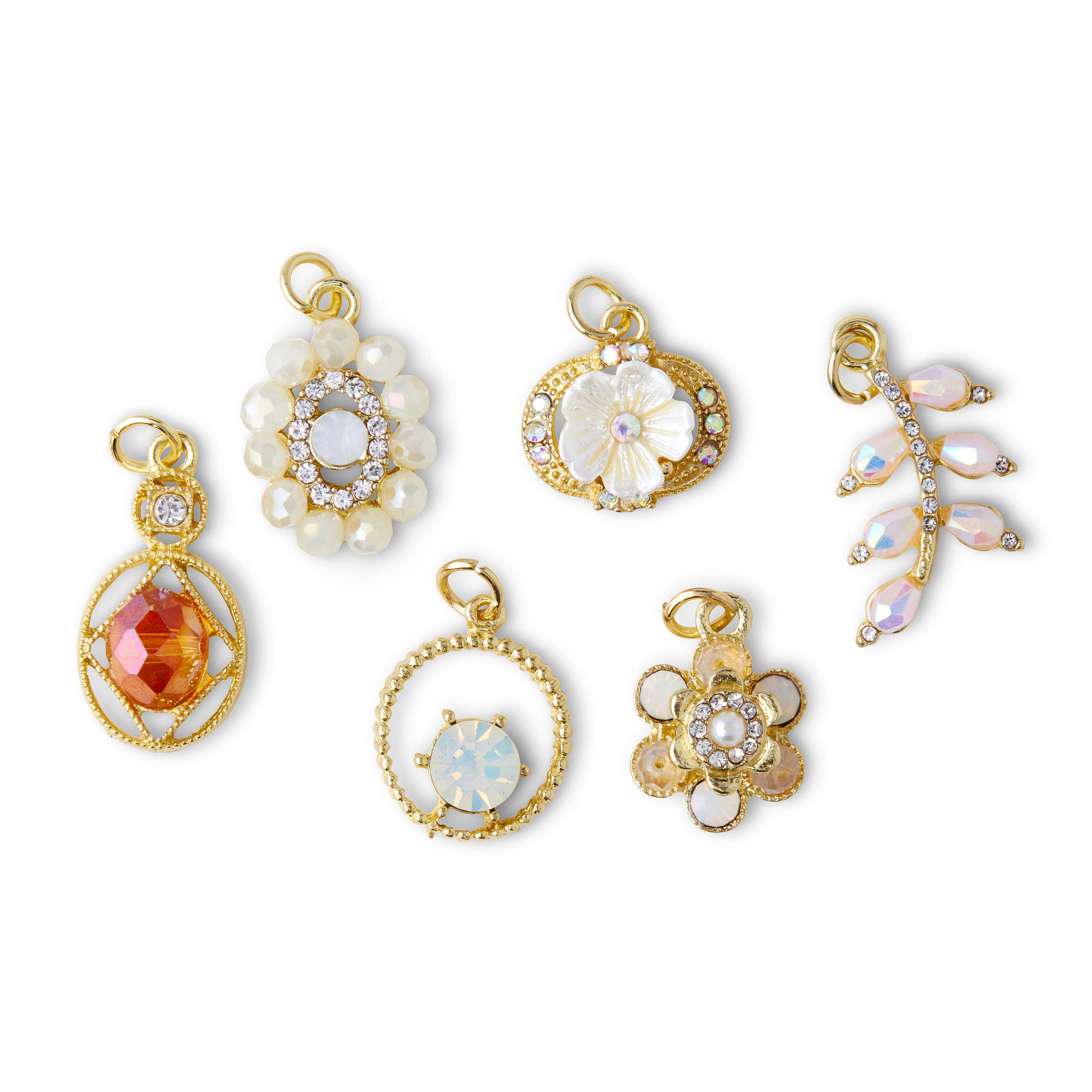 Use the hildie & jo Gold Flower Branch Charms with Stones for your next DIY project. This pack includes six unique charms in the tone of gold. The flowers and branch are created using stones of different shapes and colors, gold metal with different pattern detailing and cutouts strategically placed in several of the charms. Each charm has a jump ring for easy attachment.