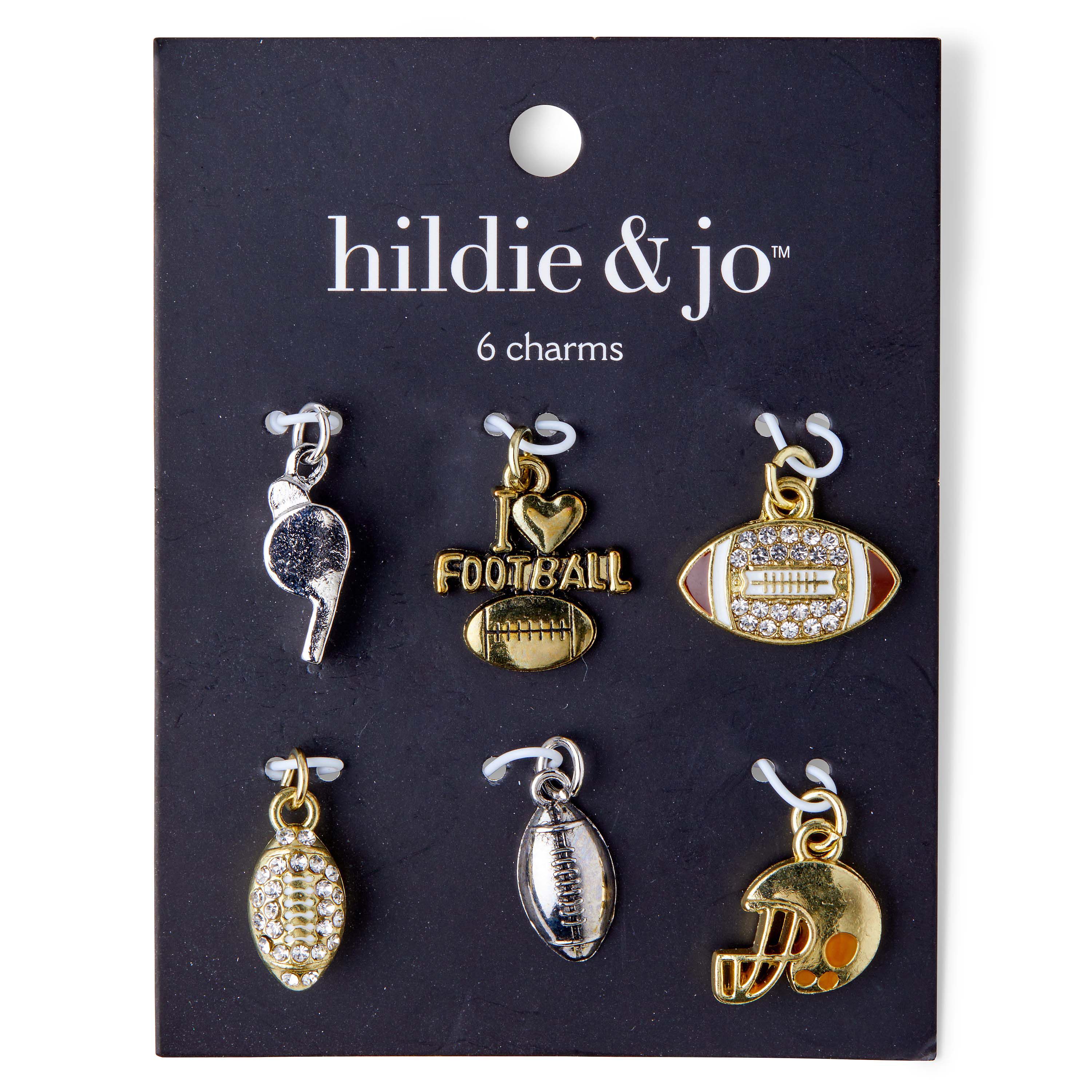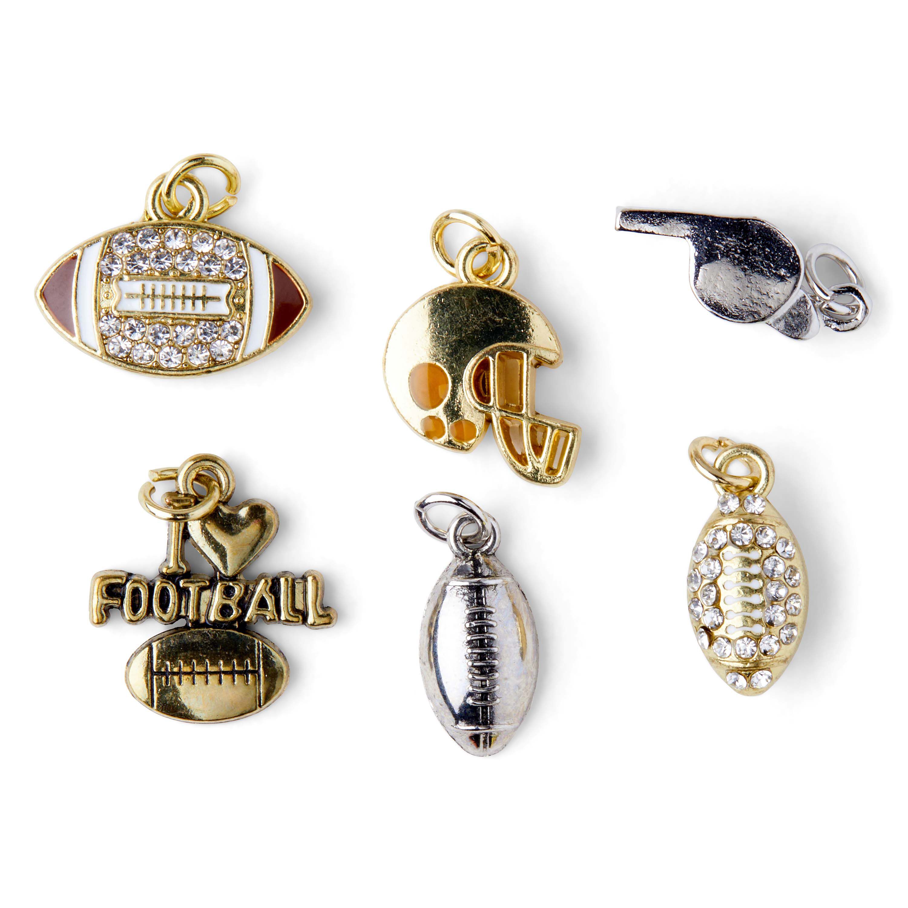 Use hildie & jo Football Charms-Gold & Silver for your next DIY project. This pack comprises six charms in the tone of gold and silver. The charms include a silver whistle, complete with detailing in the metal, an I heart football charm in gold with a football at the bottom with lace detailing. It also includes a gold football with its center having gold laces on a white background surrounded with clear round stones. Another gold football comes encased in clear stones, except the gold laces. A smooth silver football, with lace detailing and a gold football helmet complete the pack. All charms have jump rings for easy attachment. You can add them to a bracelet, necklace and more.