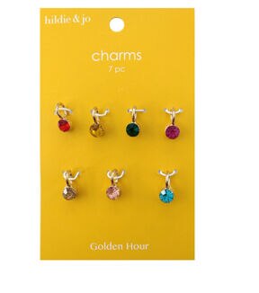 Use these round colorful charms in your next DIY project. In gold there are seven charms in all, each in the same shape. Each charm has a different colored stone in the charm. 7 pieces