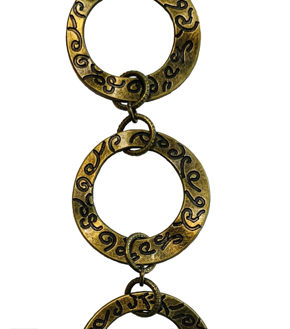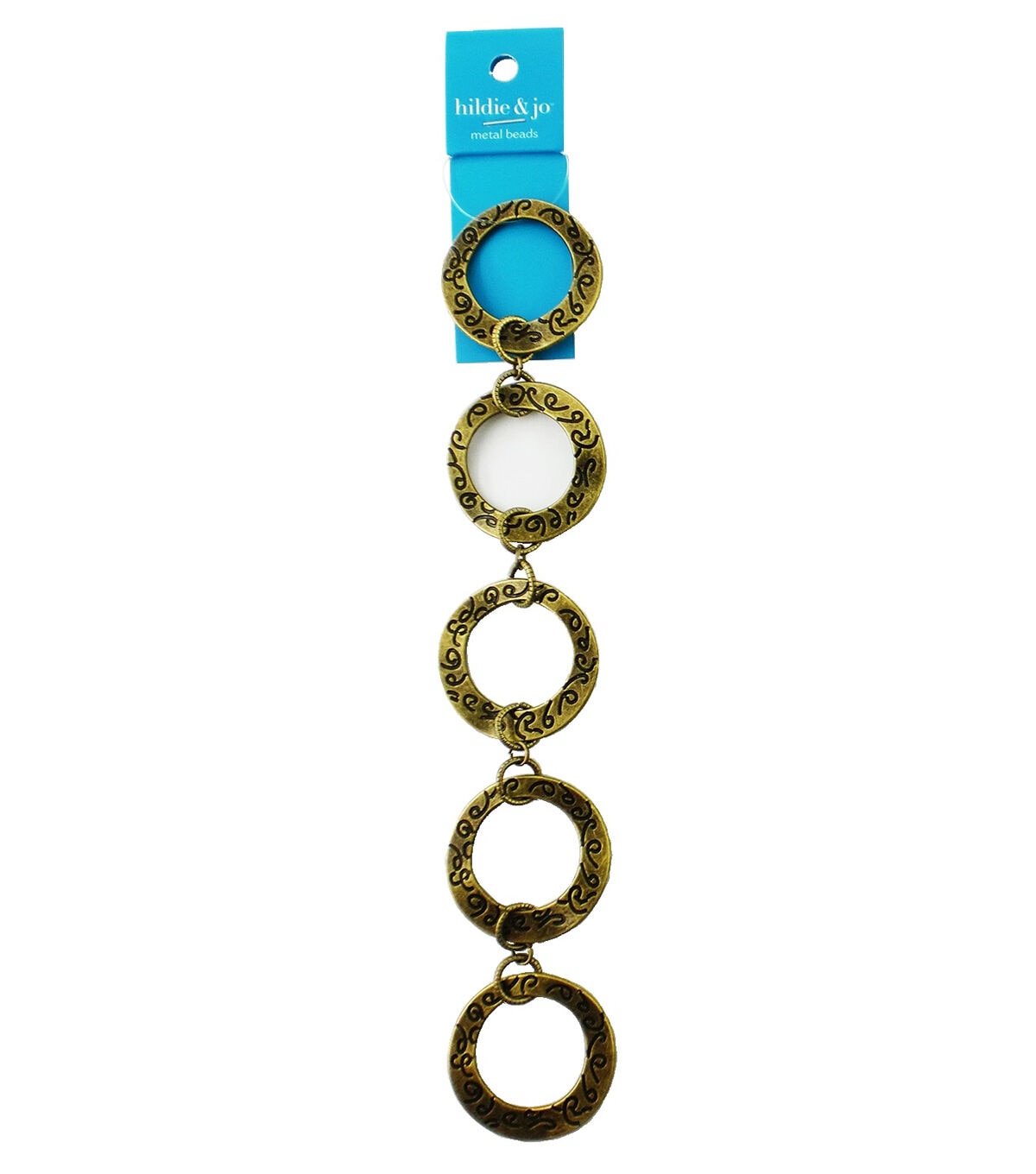 Start a new jewelry-making project using the lovely hildie & jo Large Circle Metal Etched Bead Strand - Antique Gold. This strand includes flat antique gold-toned metal beads with black scroll patterns on them for a unique look. They are great for any bracelet, necklace, keychain, earrings or other DIY projects.