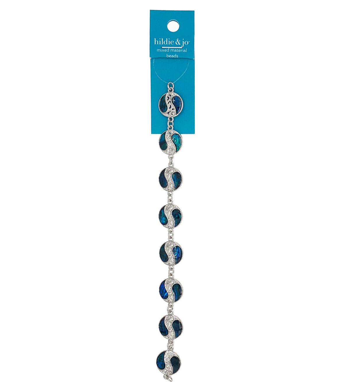 Design a customized jewelry piece for your best friend using the hildie & jo Swirl Shell & Metal Strung Beads - Blue & Silver. Strung on this 7-inch strand are round mixed material beads made of metal and shell. They are accented with a scroll design for enhanced visual appeal. You can use them individually or pair them with charms and pendants to create jewelry pieces that will stand out.