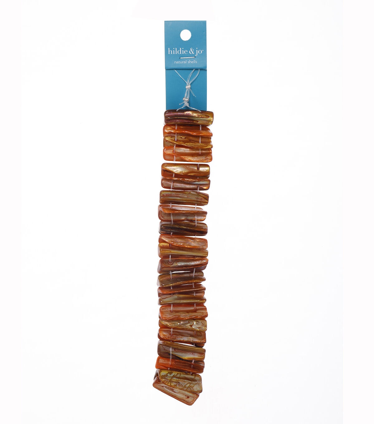 The hildie & jo 2 Hole Rectangle Shell Bead Strand - Brown will help enhance the look of your handcrafted jewelry pieces. These two-hole shell beads in orange, brown and gold shades can be used to make beautiful stretchy bracelets. You can string them on an elastic cord with or without spacers for a fast and easy project.