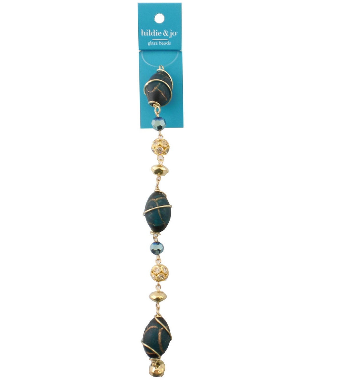 Beautify your handmade jewelry projects using the hildie & jo Wire Wrapped Stone Bead Strand - Gold & Green. This strand includes beads in various shapes and sizes on a metal wire. It flaunts dark-colored stones with a gold-toned wire wrapped around them, iridescent blue beads, round gold-toned beads with crystals and disc-shaped beads. You can also add it to the gift bag of a jewelry enthusiast.