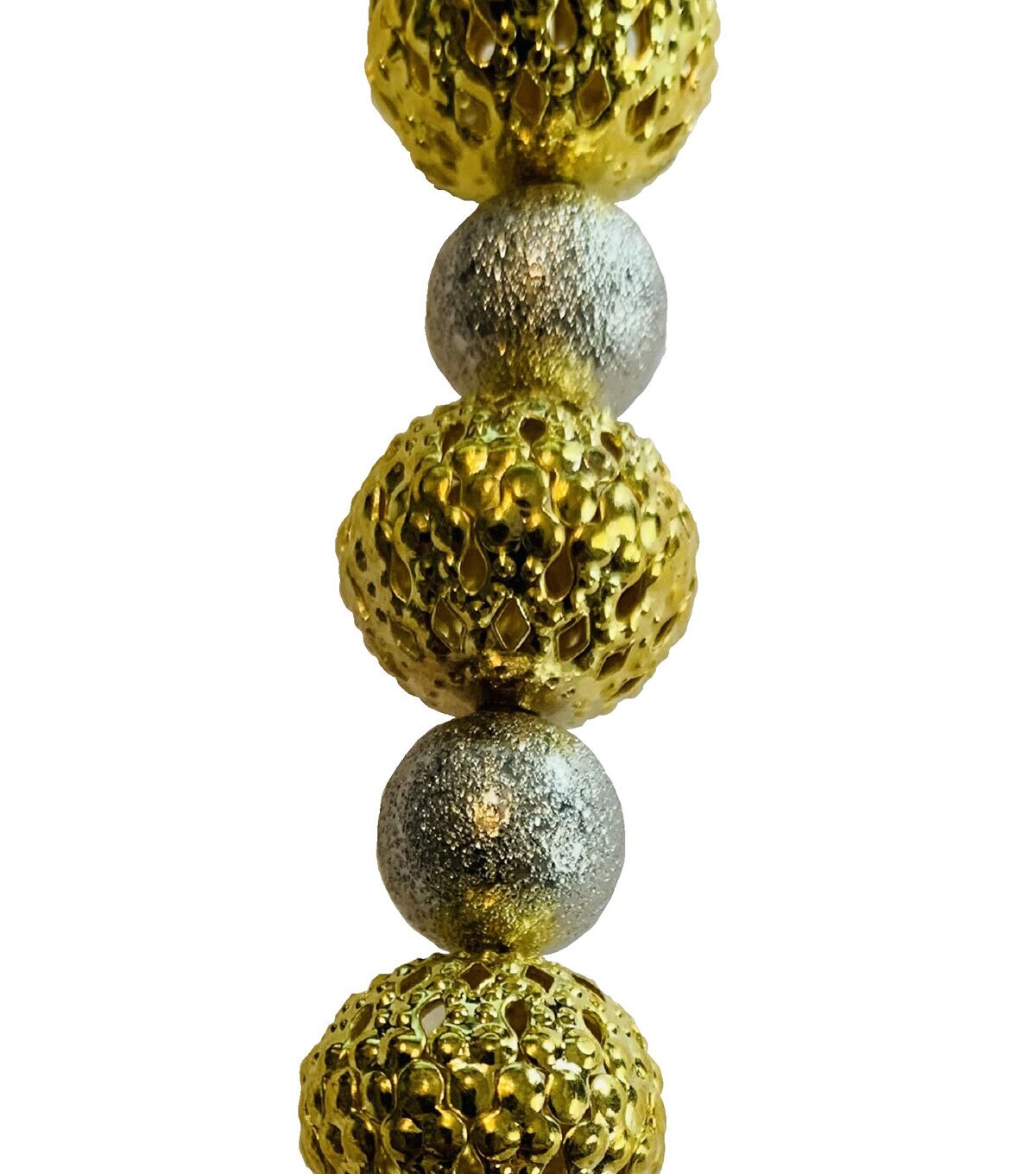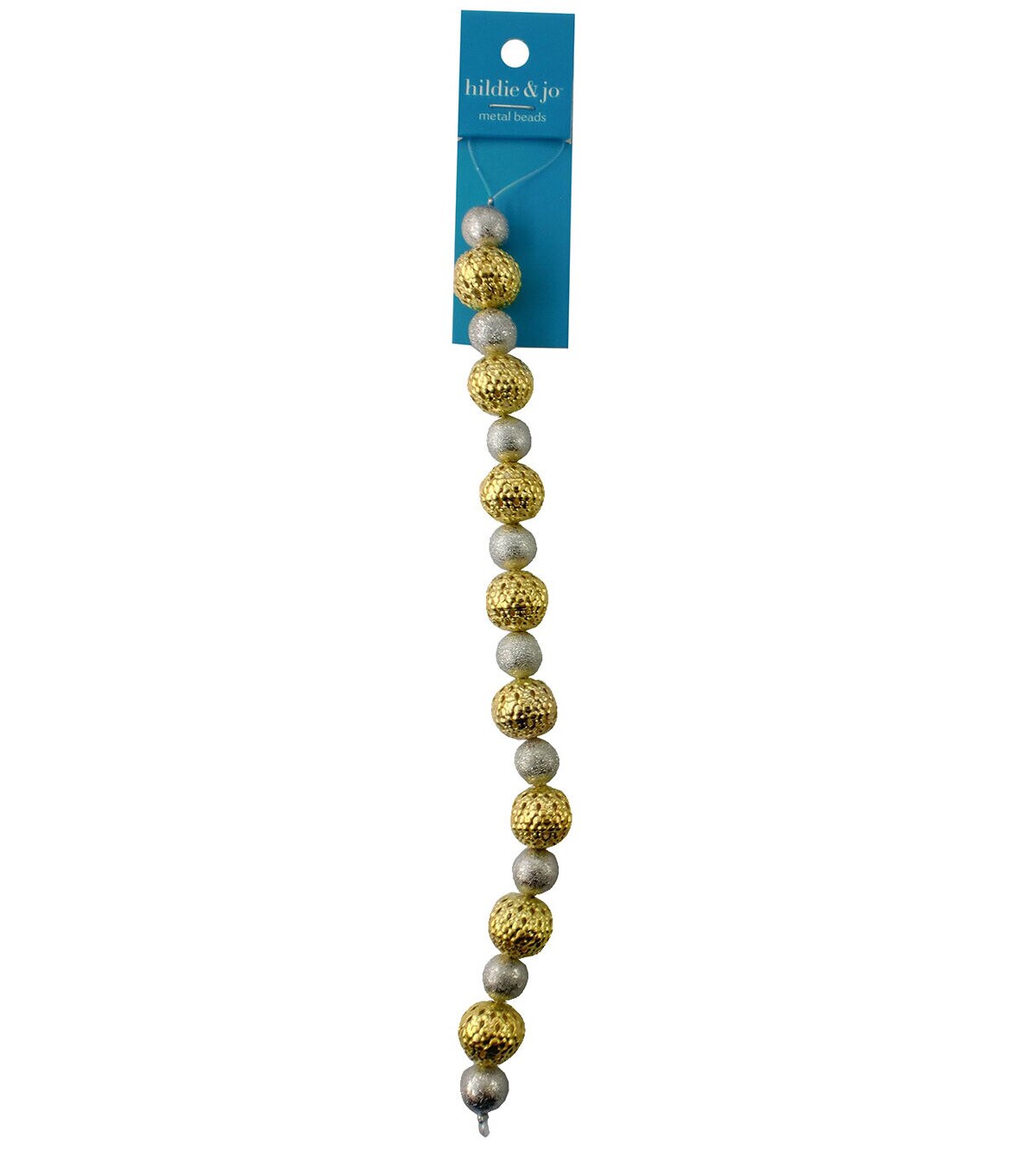 Shine amid the crowd with the hildie & jo Round Metal Bead Strand - Gold & Silver. Great for any DIY project, this 7-inch clear wire strand sports alternating round beads in gold and silver tones. The larger, gold-toned beads flaunts an open lattice texture and the silver-toned beads are smaller and glittery.