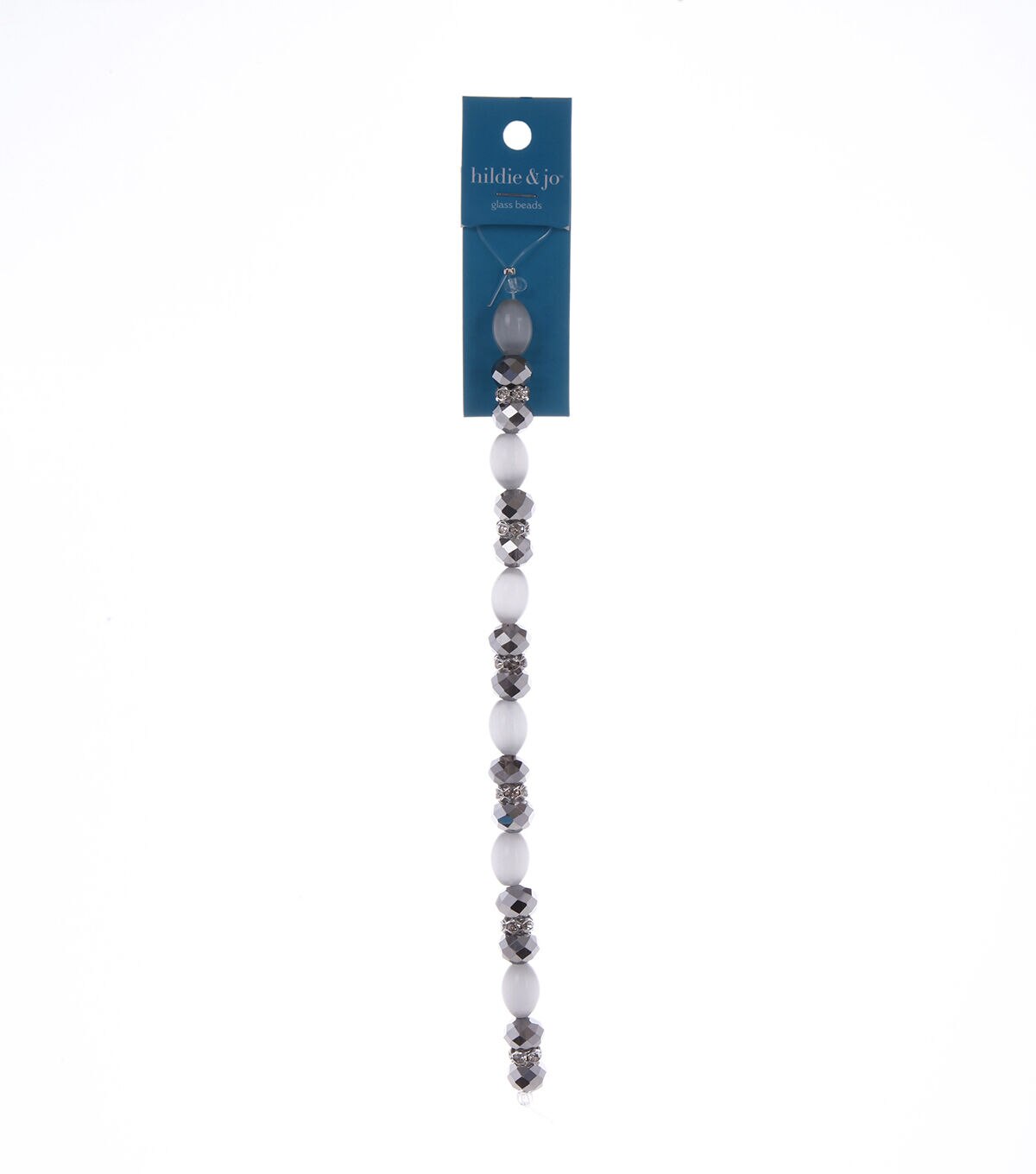 The hildie & jo Glass & Metal Crystal Cat's Eye Bead Strand - Gray will make your handmade jewelry pieces stand out. This pack includes a strand of oval cat's eye beads that glow and change appearance with light. It contains a 7-inch strand contains with gray cat's eye beads, 12 crystal rondelles and six metal and crystal spacer rondelles. You can use them to design lovely necklaces, bag charms, danglers and more.