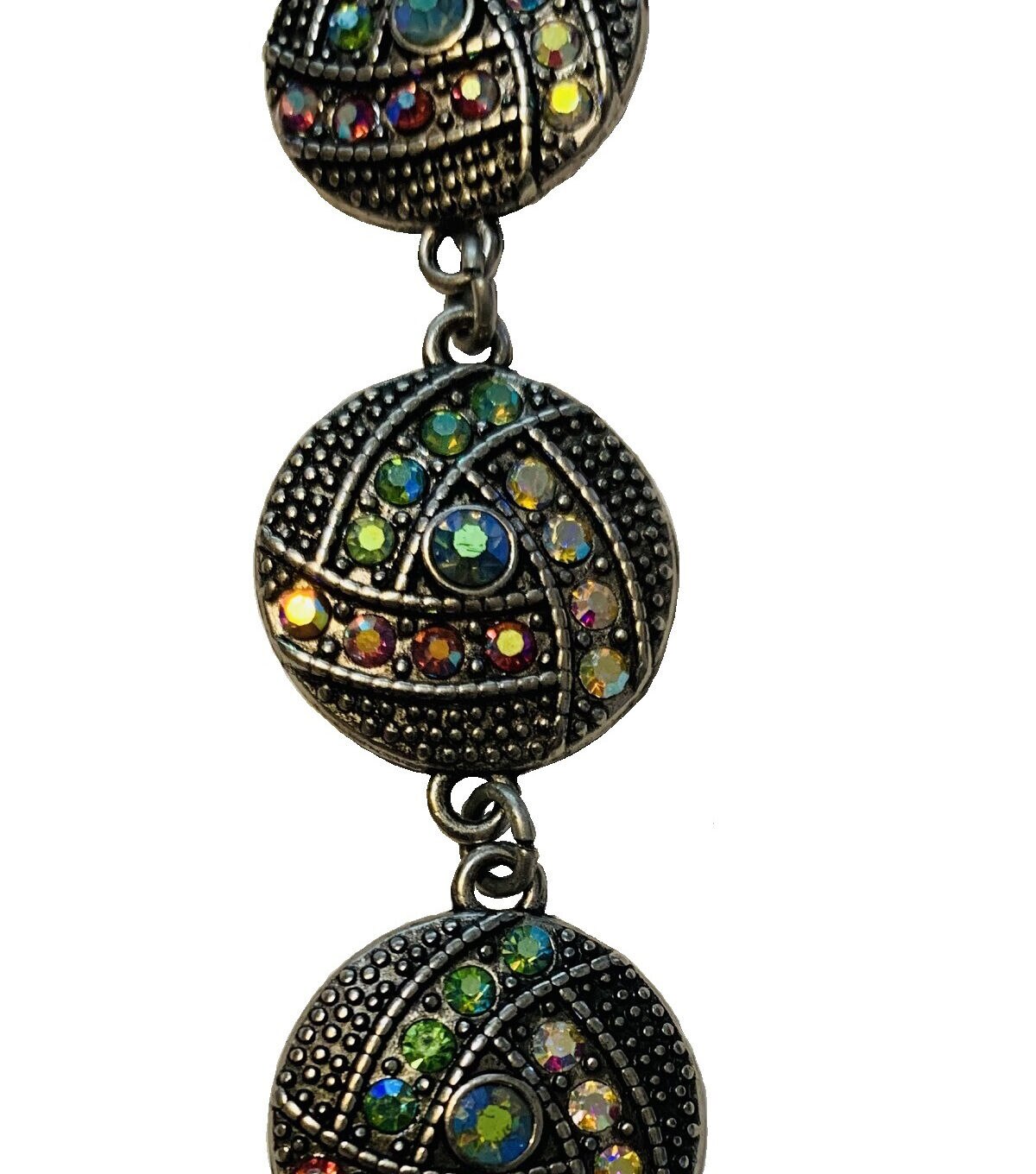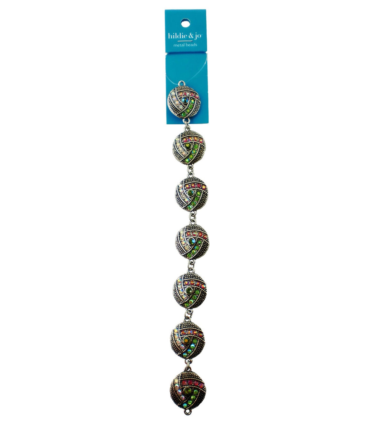 Add a minimalistic touch to your jewelry pieces using the hildie & jo Woven Flat Round Metal Strung Beads - Green, Pink & Clear. This strand is composed of flat, round beads with a green center stone surrounded by rows of pink, green and clear crystals. The surrounding metal is accented with a dotted pattern. These beads are attached to jump rings. Use them to create bracelets, accentuate necklaces and more.
