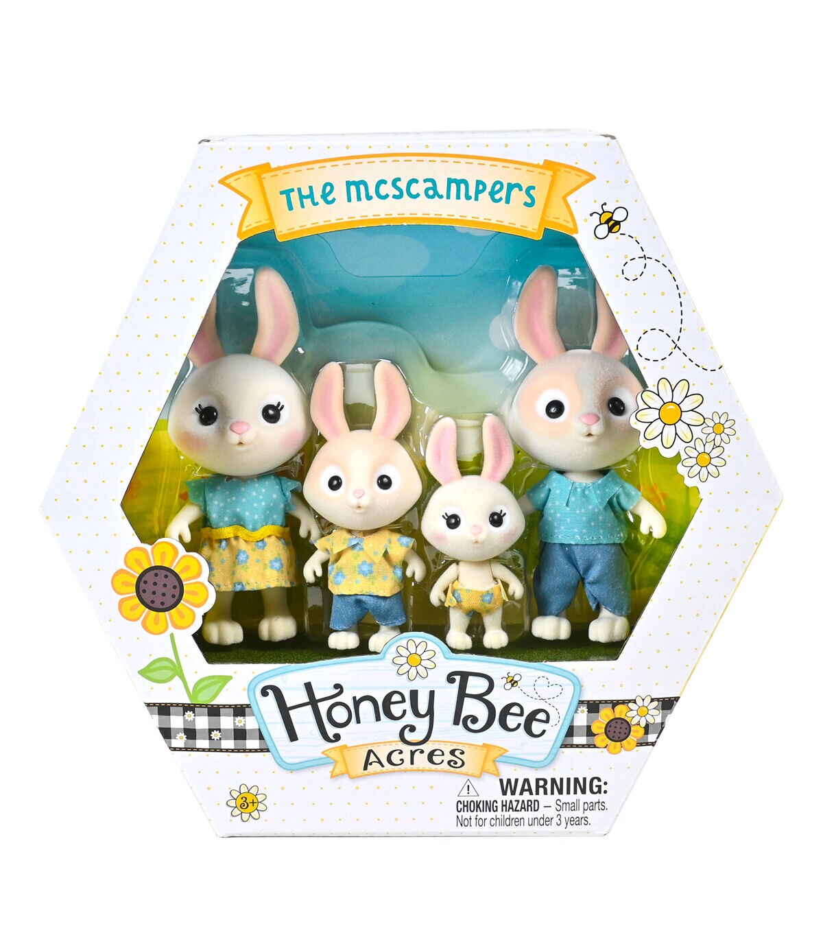 Welcome to the world of Honey Bee Acres dollhouses, playsets, and figures where the pretend play is sweet, and the product detail is fresh and colorful! Meet The McScampers Rabbit Family, parents Milo and Daisy, son Jax, and baby Petunia! Each posable flocked figure wears a whimsical printed outfit that is removable for fun fashion play. This lively family is always on the move! Today, Dad Milo and Mom Daisy are busy running the Apple Ridge Farmer’s Market, and there’s so much to do! Daisy has asked Jax to take care of his baby sister Petunia, who likes hiding behind the food bins and nibbling on carrots when no one is looking! Join in the fun and create more pretend adventures together, and make every day a special day!