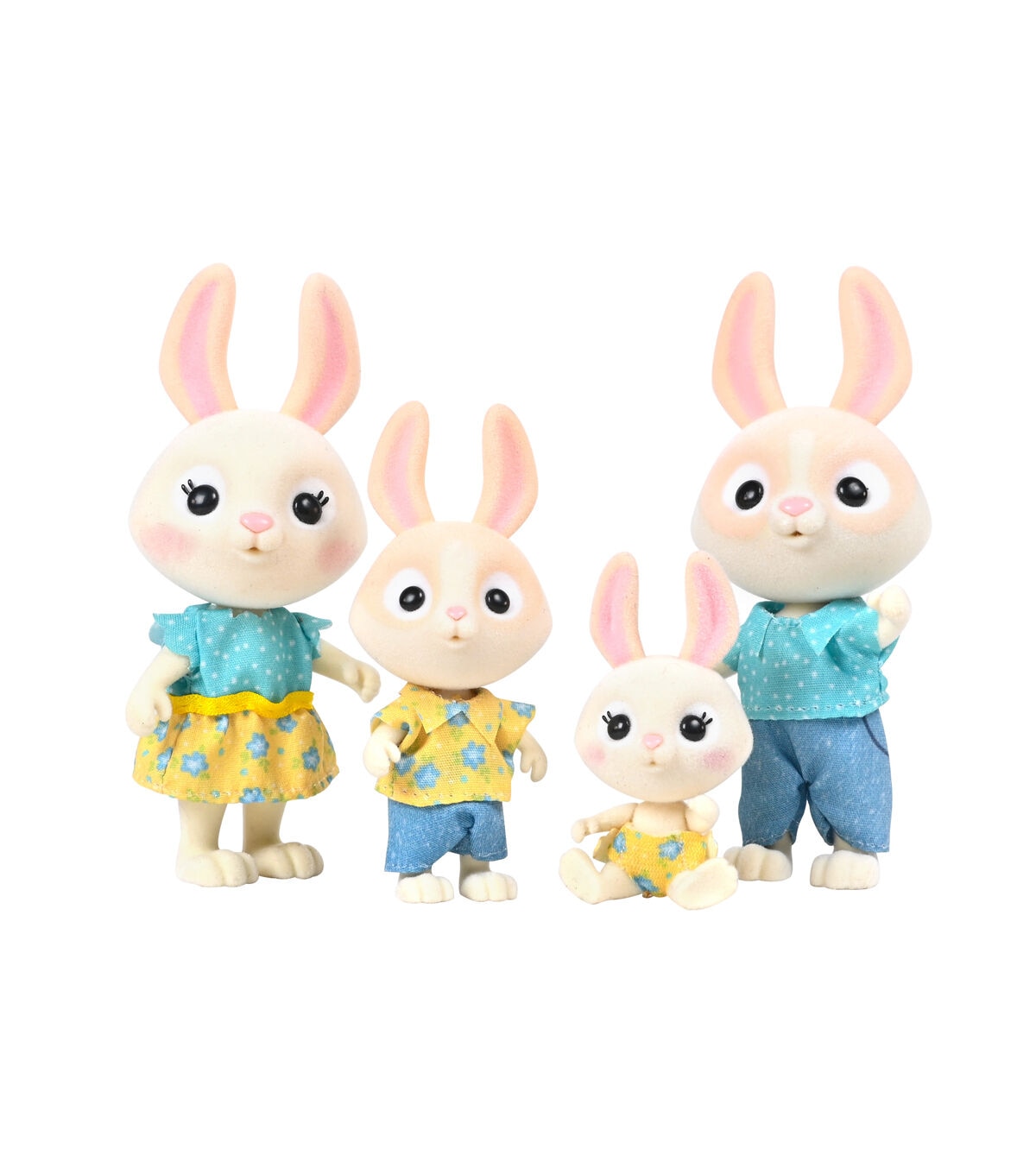 - The toy set includes 4 miniature flocked rabbit characters: 2 parents and 2 kids