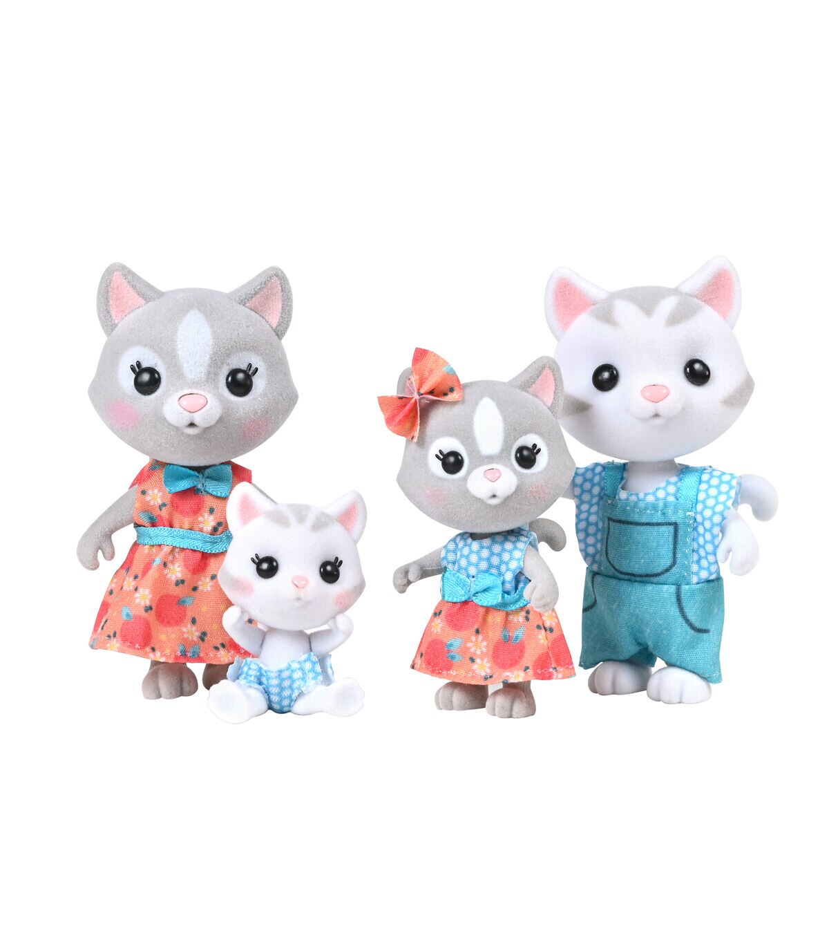 - The toy set includes 4 miniature flocked cat characters: 2 parents and 2 kids