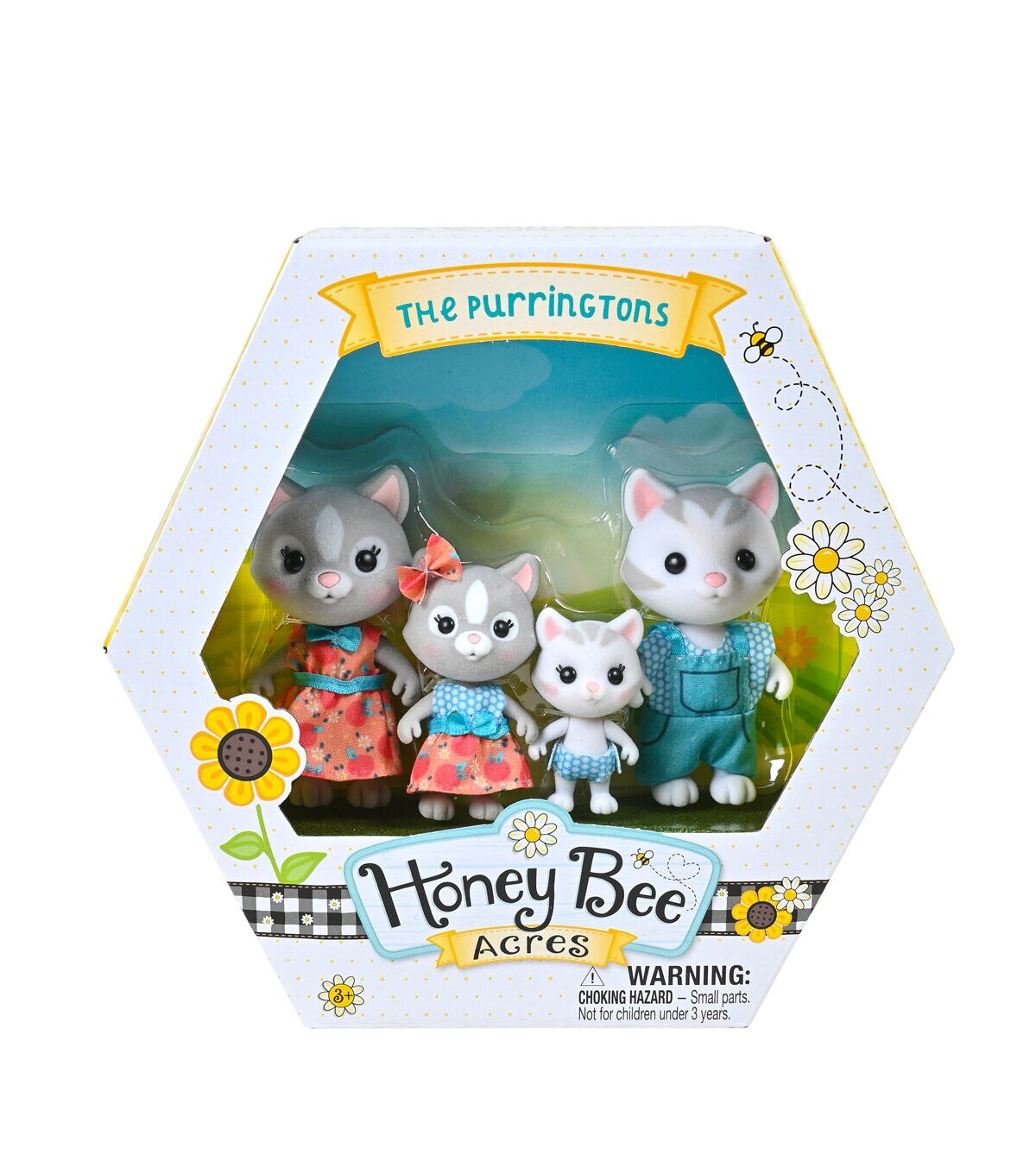 Welcome to the world of Honey Bee Acres dollhouses, playsets, and figures where the pretend play is sweet, and the product detail is fresh and colorful! Meet The Purringtons Cat Family, parents Fritz and Ella, daughter Zoe, and baby Rose! Each posable flocked figure wears a whimsical printed outfit that is removable for fun fashion play. This outdoorsy family is preparing for the big event in Rainbow Ridge! It's the Harvest Festival, and Mom Ella and her daughter Zoe are looking forward to entering their prized pumpkin pie into the baking contest. Meanwhile, Dad Fritz is busy working on his farm truck for the purr-fect hayride with baby Rose! Join in the fun and create more pretend adventures together, and make every day a special day!