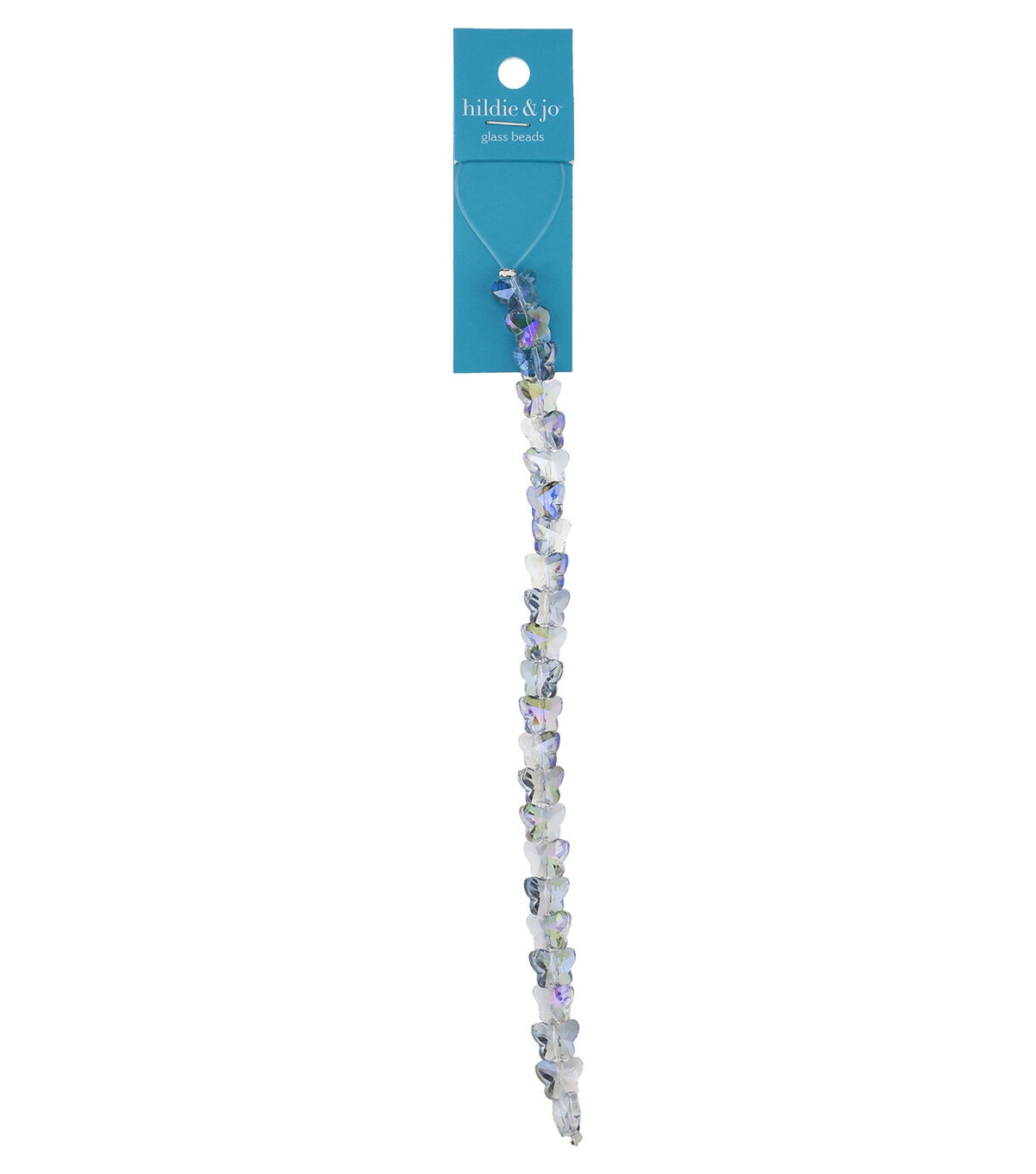 Lend a dazzling look to your jewelry projects with the hildie & jo Butterfly Glass Bead Strand - Iridescent Blue. This 7-inch strand flaunts iridescent blue glass beads crafted in the shape of a butterfly and strung in a clear wire. These beads are great for any DIY or beading project.