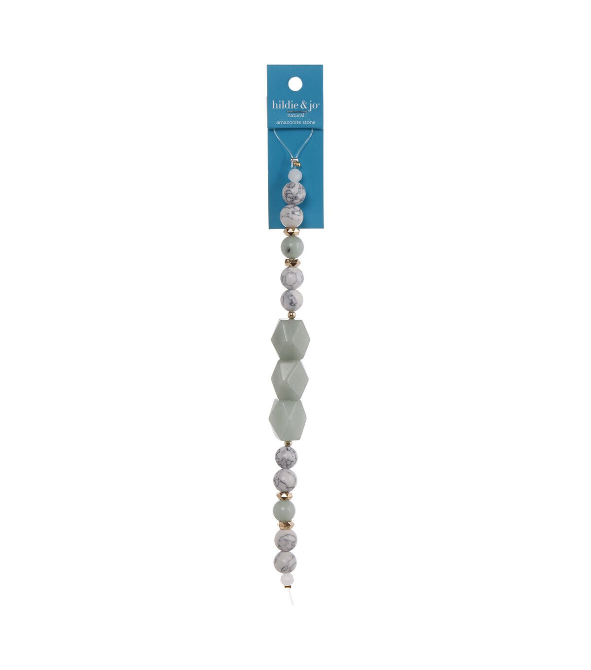 Be the fashion diva at any party by donning a graceful bracelet made using the hildie & jo Amazonite Stone Strung Beads - Mint & White. This 7-inch long beaded string comes with three, large, mint green beads that are artistically accented with small, round, blue and white beads for added visual display. These beads are made of glass, howlite and polyethylene.
