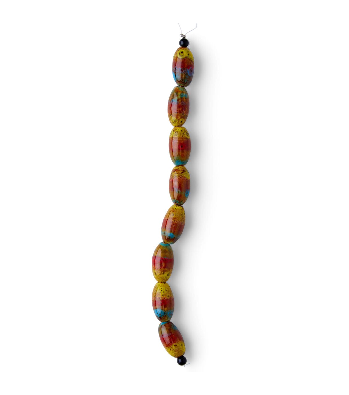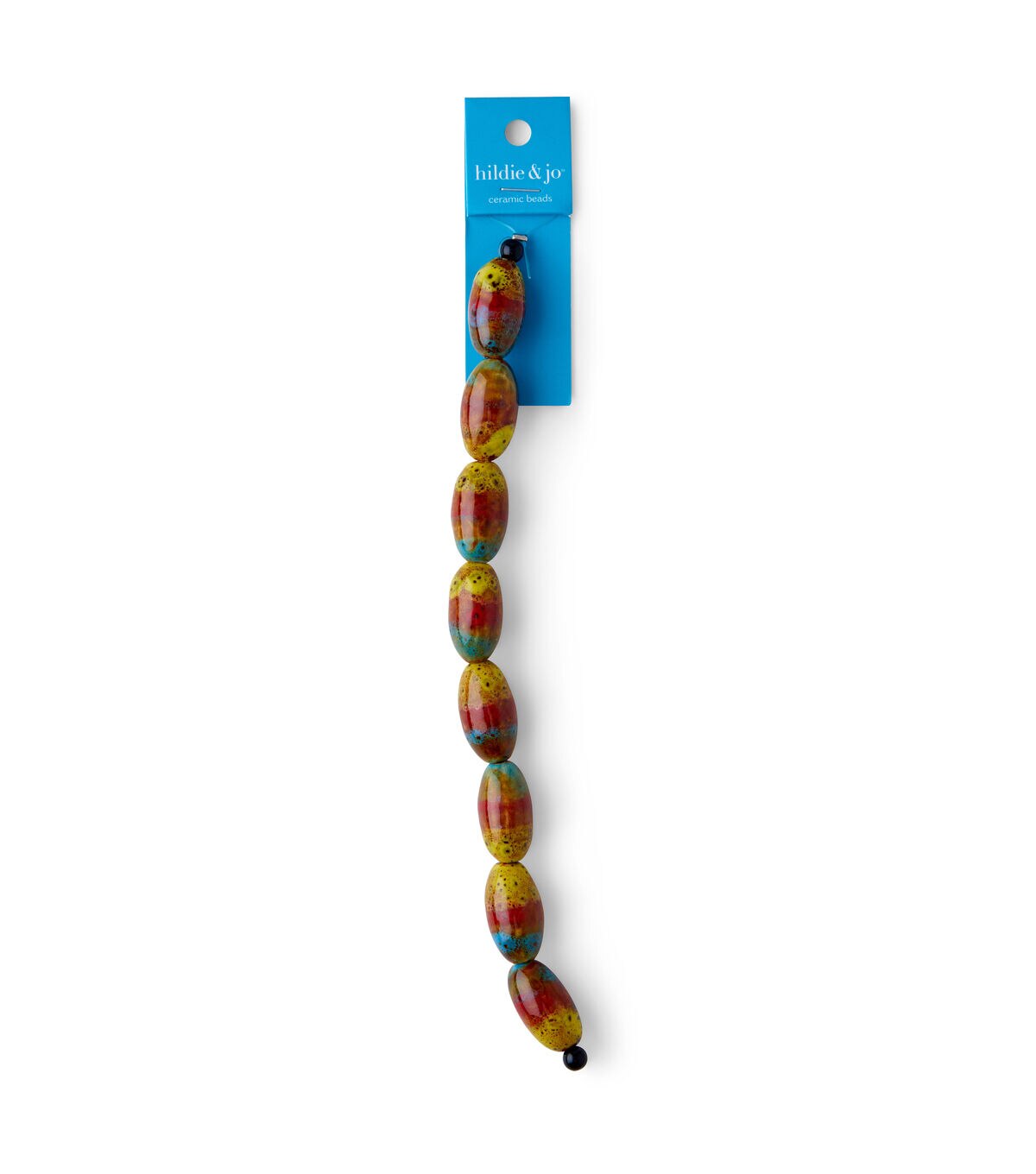Design unique beaded jewelry using the hildie & jo Oval Ceramic Strung Beads - Multi Stripes. This pack contains handcrafted, oval-shaped ceramic beads striped in tones of yellow, blue and red. Use them to design necklaces, earrings, charms bracelets and a lot more. You can also mix and match them with complementing beads for enhanced visual flair.