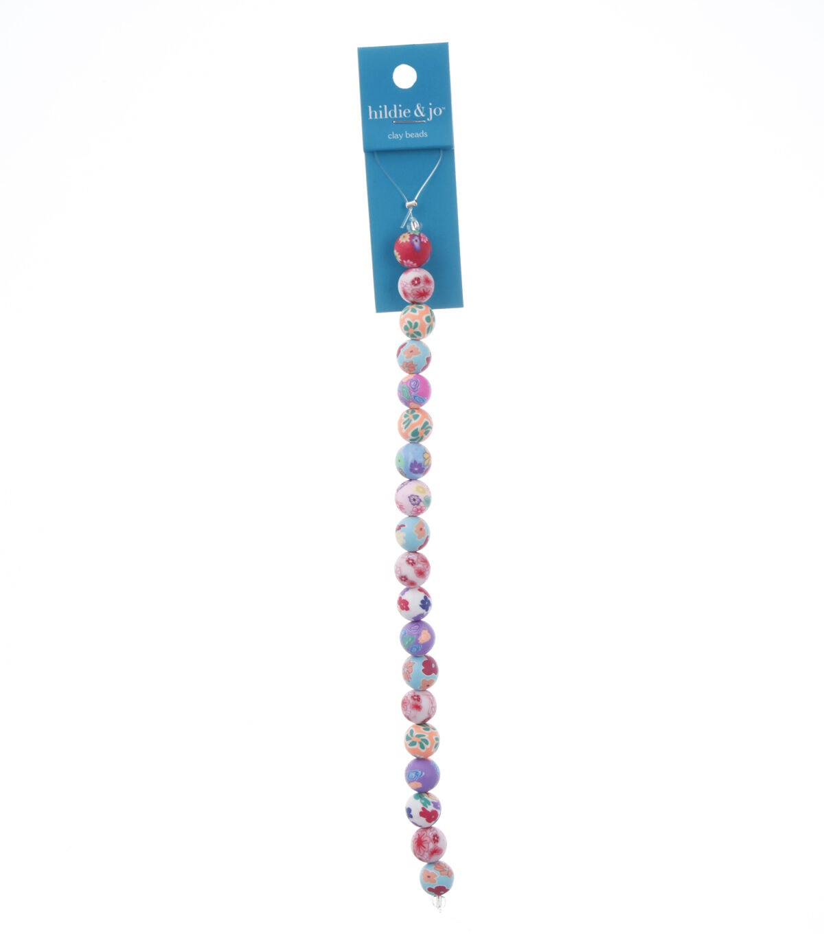Lend a unique and intricate look to your handmade jewelry pieces with the hildie & jo Round Polymer Clay Bead Strand - Multi Floral Print. This 7-inch strand of round polymer clay beads sports assorted colors and patterns. Crafting and beading possibilities are endless with these beads flaunting bright and fun designs.