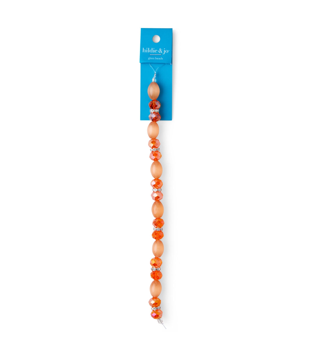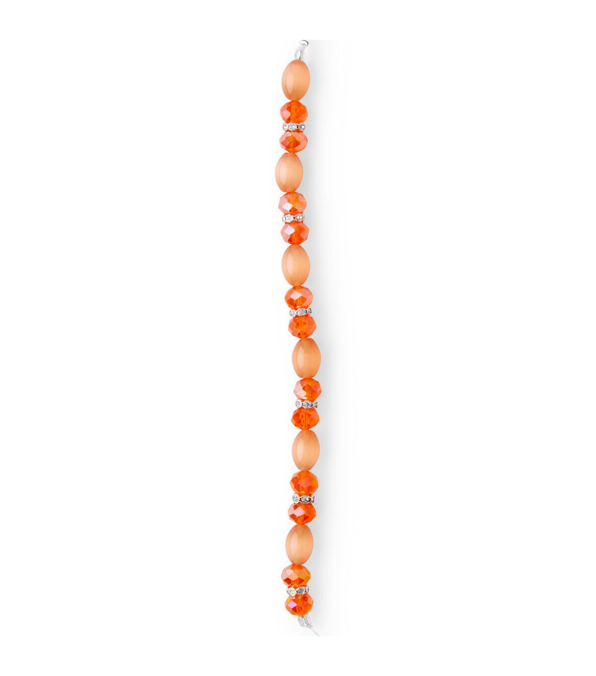 Designing elegant jewelry will be a breeze with the hildie & jo Glass & Metal Crystal Cat's Eye Bead Strand - Orange. This 7-inch strand contains six cat's eye beads, 12 crystal rondelles, and six metal and crystal spacer rondelles. These oval cat’s eye beads give out a lovely glow and change color under light. Use these beads to create lovely bracelets, necklaces, bag charms and more.