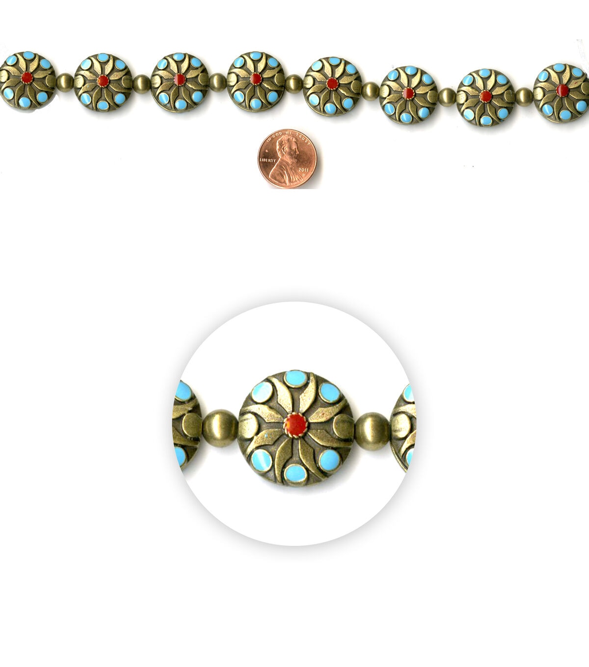 Create stunning pieces of jewelry using the hildie & jo Flat Round Metal Enamel Strung Beads - Oxidized Brass Floral. This pack includes a strand of round metal beads with a beautiful floral detail on each. Team them with glass beads and charms to design unique bracelets, anklets, neckpieces and lots more.