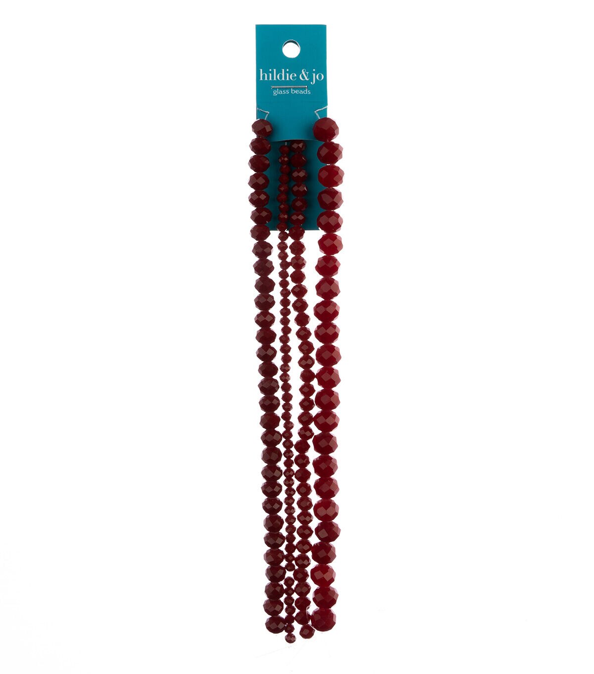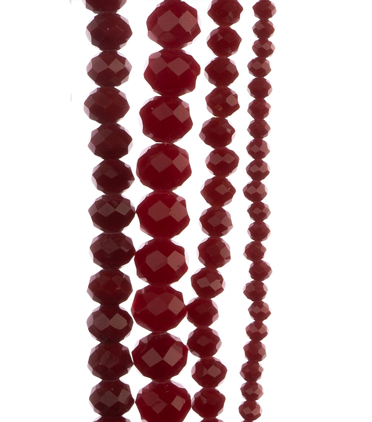 Design beautiful handmade jewelry with the hildie & jo Rondel Faceted Glass Strung Beads - Red. This pack includes four strands of glass beads in red measuring 4 mm, 6 mm, 8 mm and 10 mm. These rondelle beads are faceted and reflect light. You can use them to put together fashionable beautiful earrings, neckpieces, keychains and more.