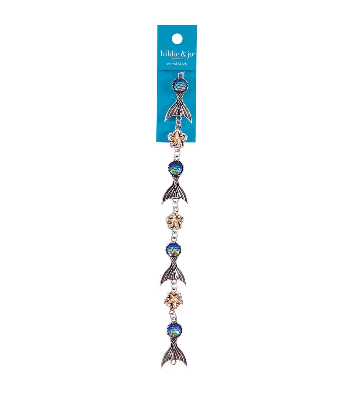 Flaunt your love for mermaids with the hildie & jo Mermaid Tail Metal Strung Beads - Silver & Gold. This string includes metal beads shaped like mermaids along with beads displaying a starfish design. You can pair these beads along with other charms, keychains and accents to rock the perfect beach look.