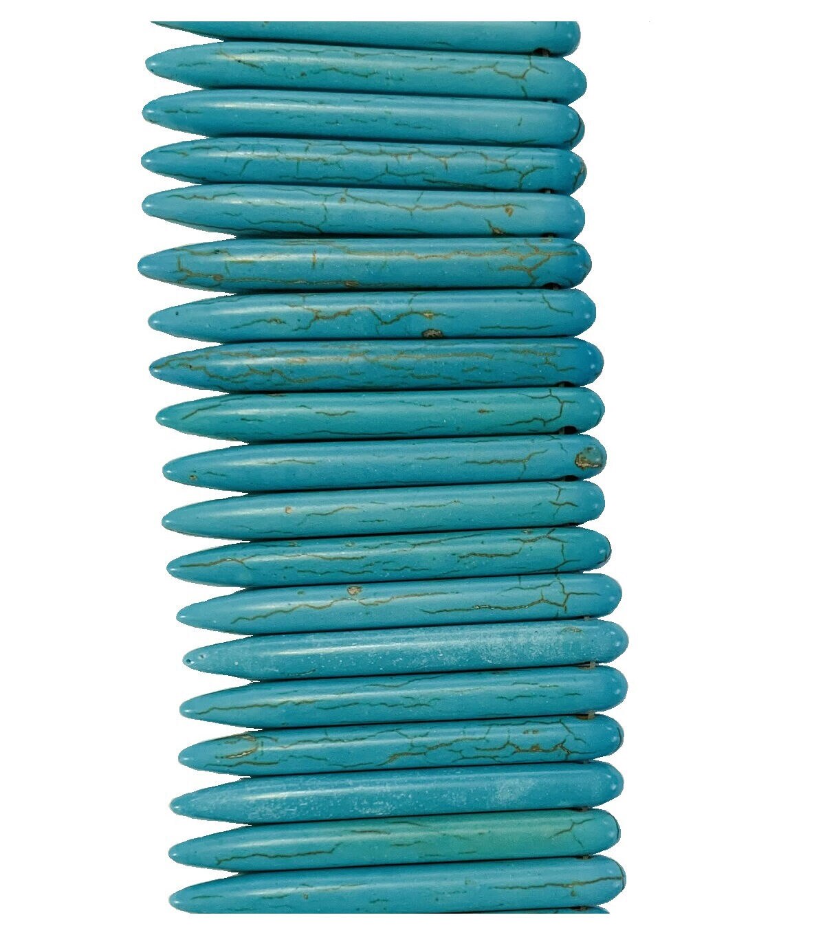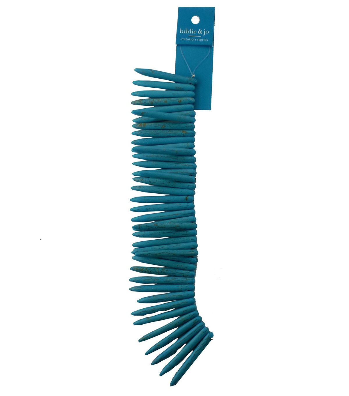 Create unique, handmade jewelry with the hildie & jo Narrow Pointed Imitation Stone Strung Beads - Turquoise. This 7-inch strand displays beads made from turquoise stone. Each bead is long, slender and spike-shaped. All beads are turquoise in color, some sport a pattern or textured finish. You can also use these beads to accentuate DIY decor or craft projects. These beads come on a clear wire.