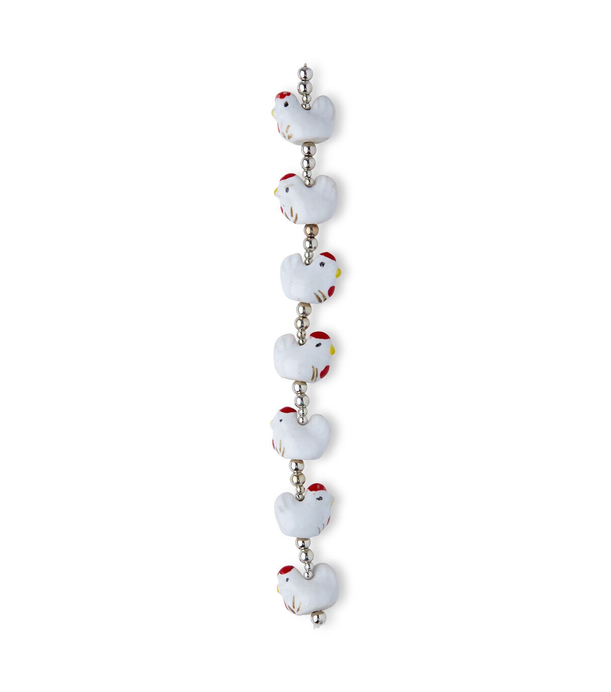 Add a barnyard-inspired touch to DIY jewelry projects with the hildie & jo Ceramic Rooster Strung Beads - White. These white, 19 mm, ceramic beads are shaped like roosters with red accents for a realistic look. They come with round, silver-toned beads in between for added charm.