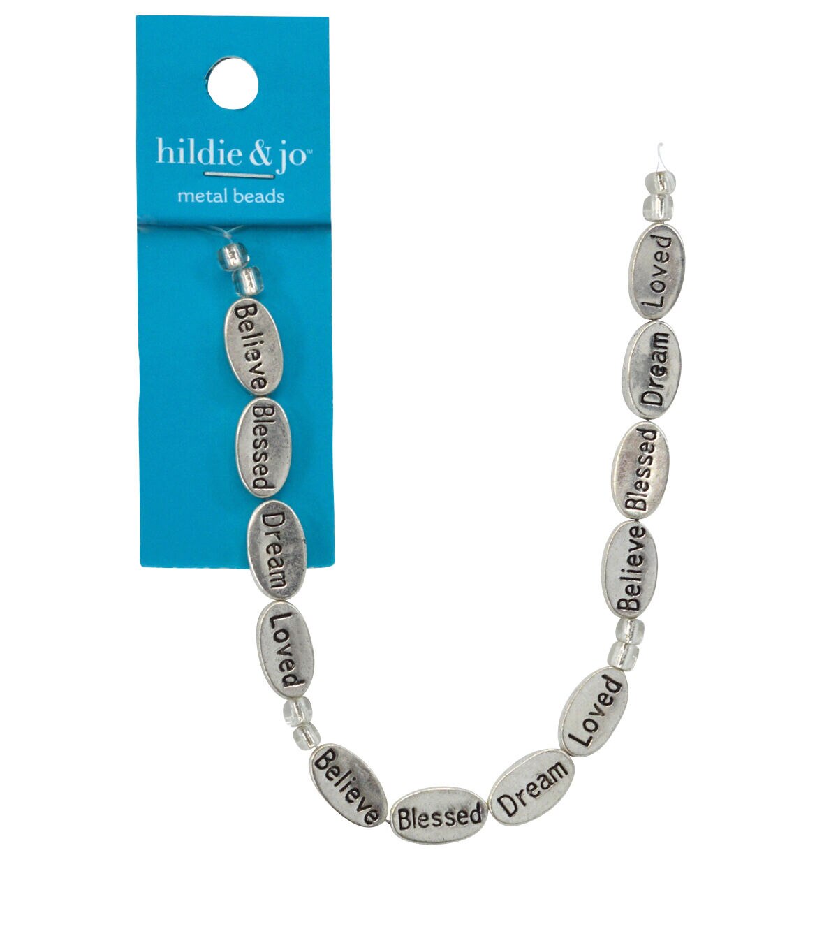 The hildie & jo Metal Strung Beads - Words will add an attractive look to your customized jewelry designs. This pack includes metal beads that come with an antique finish for visual charm. Each bead is engraved with an inspiring word. Team them with colorful glass beads and a charm to put together a unique handmade creation.