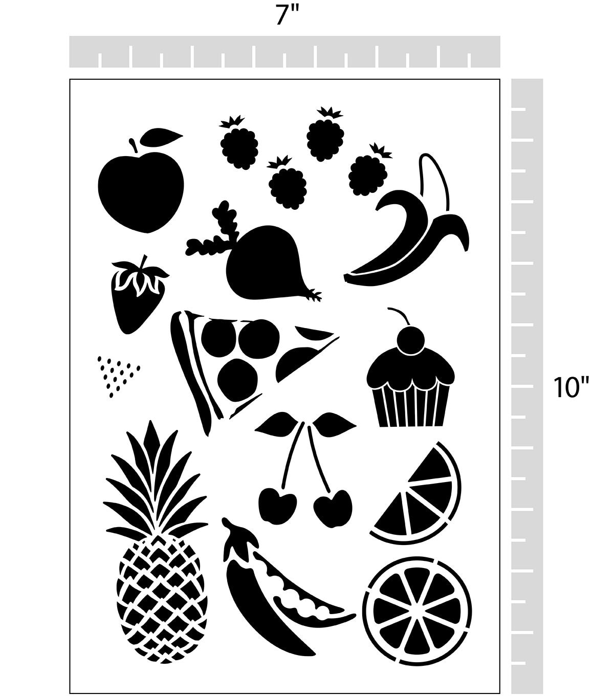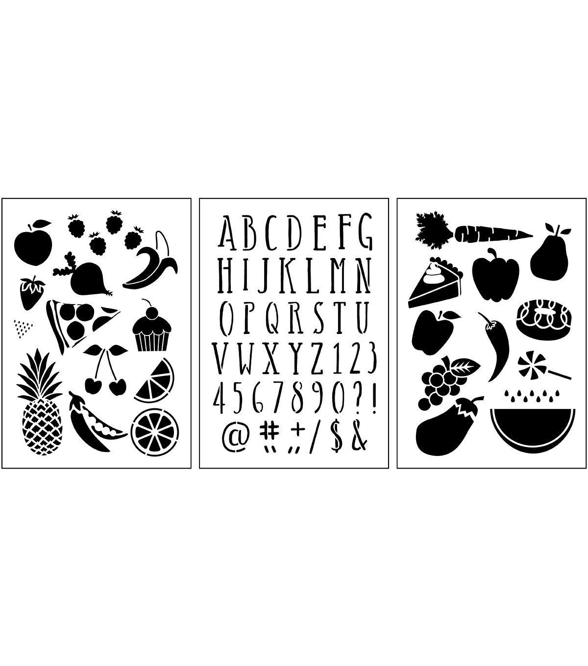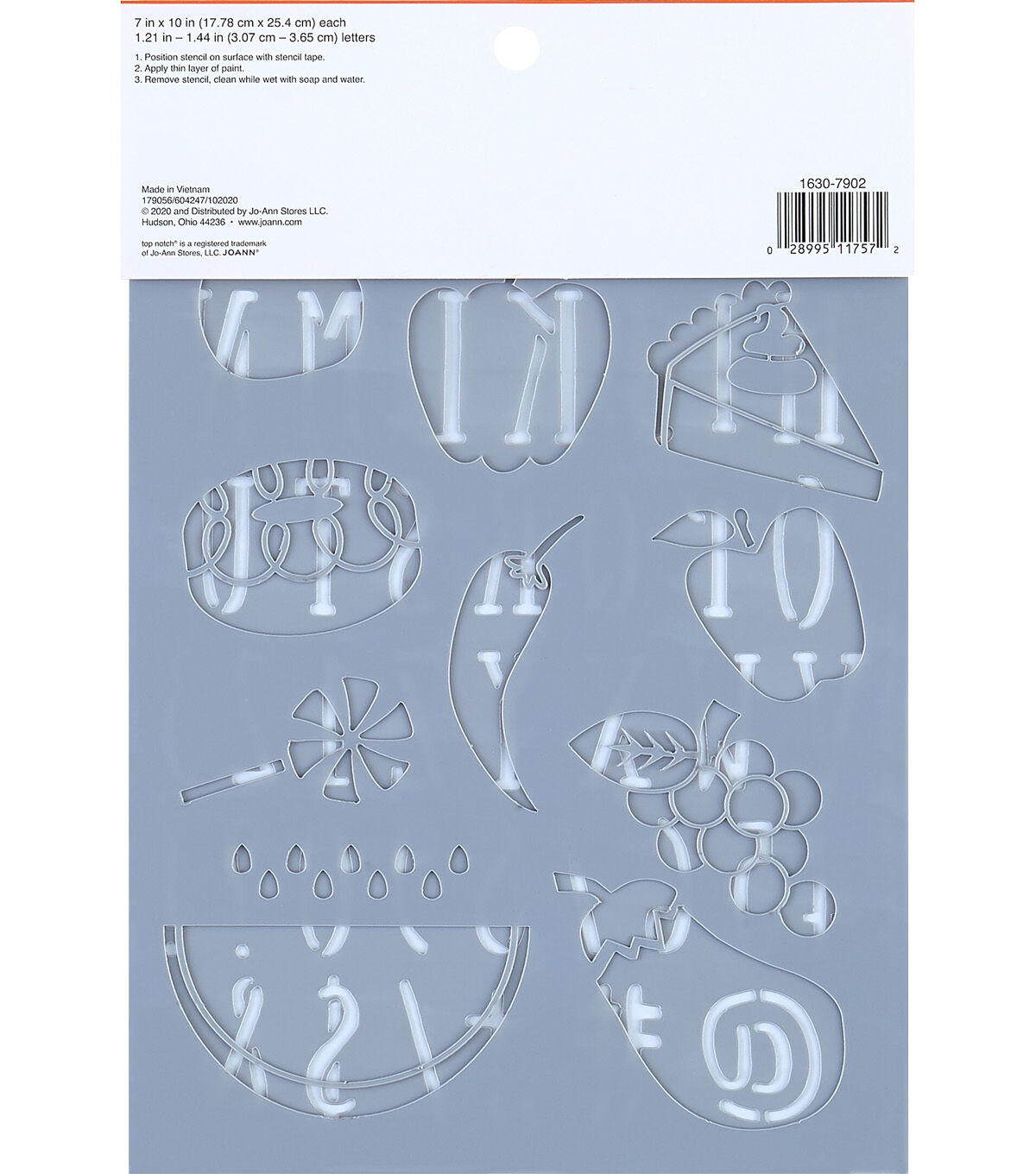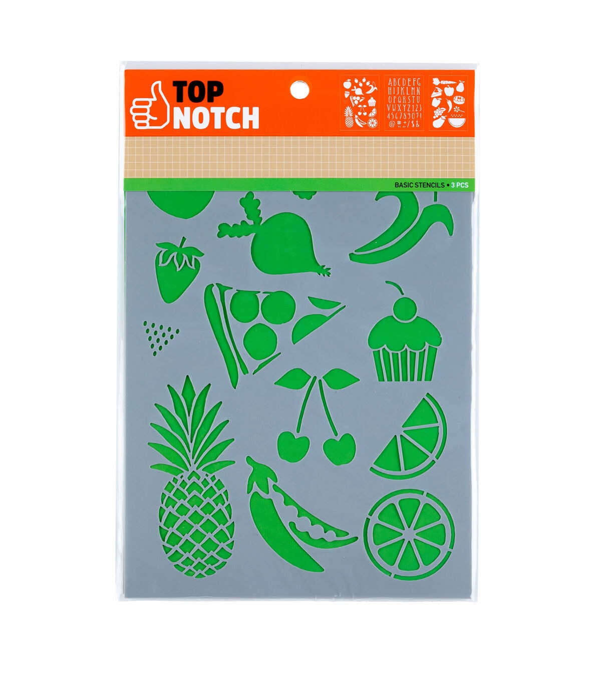 Stencil your favorite foods to your creations with the Top Notch Fruits and Veggies Stencil Pack. This pack of 3 stencils features a variety of fruits, vegetables, and letters to complete your project. Durable and reusable, these plastic stencil sheets are easy to clean up with mild soap and warm water. Encourage healthy eating by stenciling with the Top Notch Fruits and Veggies Stencil Pack.Stencil your favorite foods to your creations with the Top Notch Fruits and Veggies Stencil Pack. This pack of 3 stencils features a variety of fruits, vegetables, and letters to complete your project. Durable and reusable, these plastic stencil sheets are easy to clean up with mild soap and warm water. Encourage healthy eating by stenciling with the Top Notch Fruits and Veggies Stencil Pack.