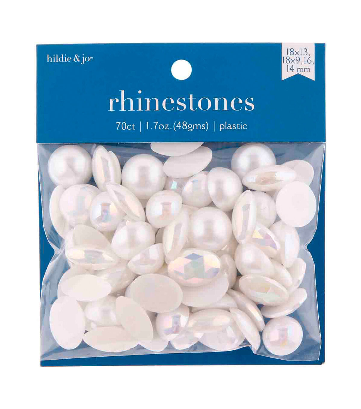 Heighten the charm of bracelets, earrings, bags, headbands and much more with the hildie & jo Assorted Plastic Flat Back Rhinestones - White. This pack includes 70 flat-back rhinestones in an assortment of shapes, sizes and facets. Pair them with other coordinating jewelry pieces to make beautiful bracelets, necklaces, anklets and more.