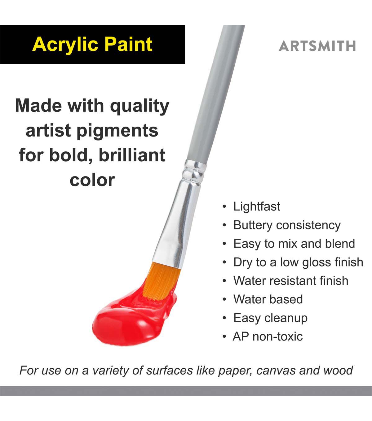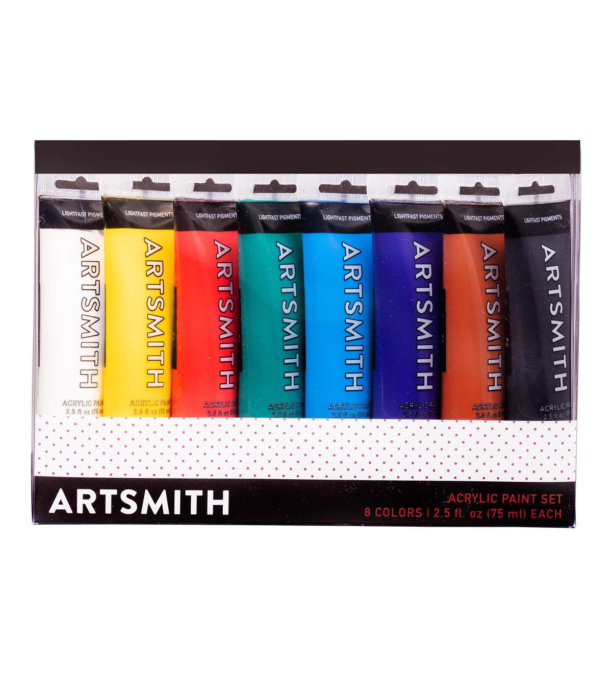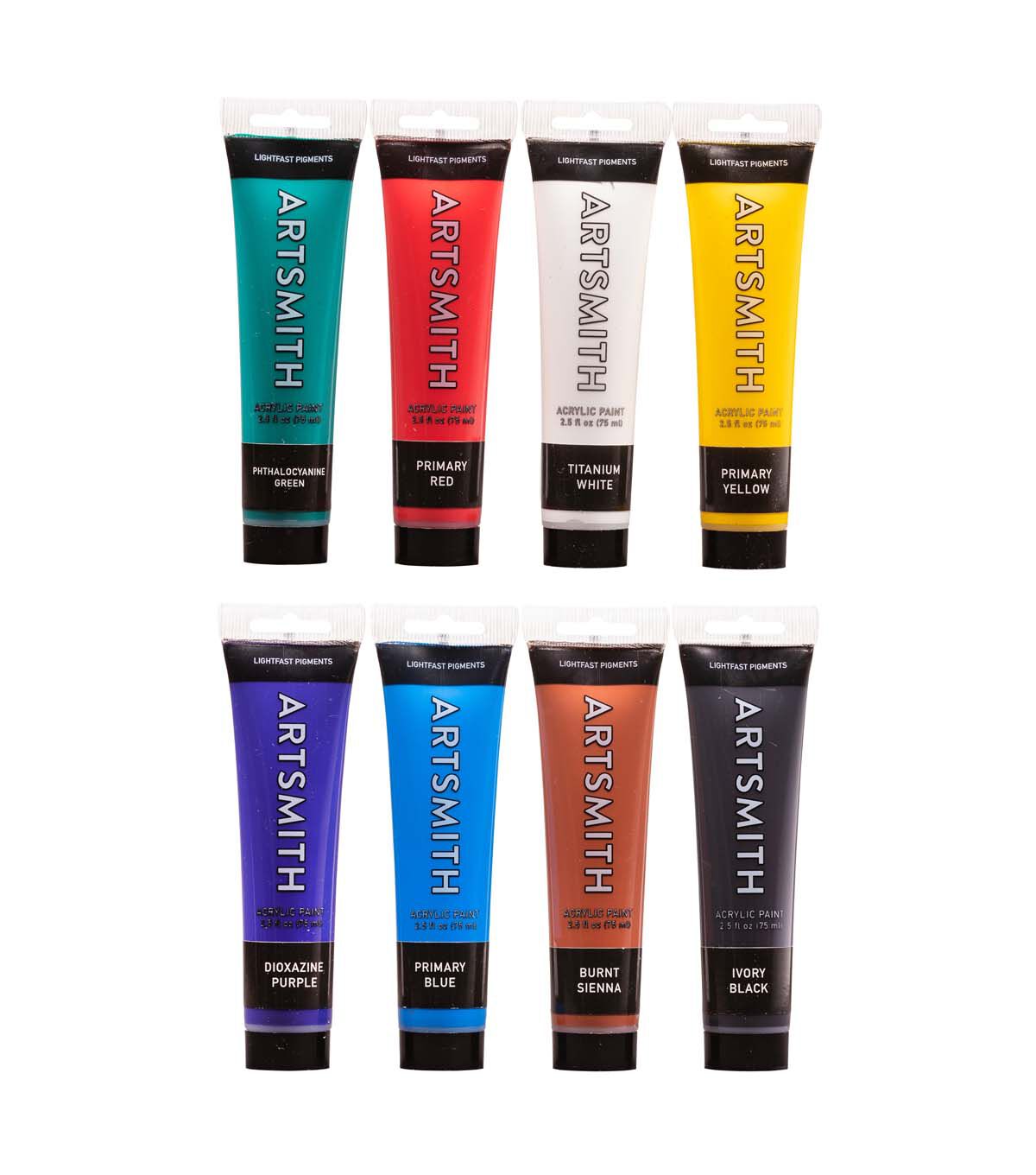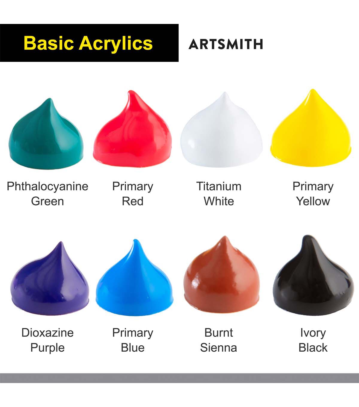 Artsmith Acrylics are created for all artists. Made with lightfast, artist quality, pigments, these paints have bold, briliant color, a buttery consistency for easy mixing and blending, and dry to a low gloss, water resistant finish. Water based and AP non-toxic, use Artsmith Acrylics on surfaces such as paper, canvas and wood. Set contains 8 essential 75ml colors including 1 each of the following 75 ml tubes: Titanium White, Ivory Black, Primary Yellow, Primary Red, Phthalocyanine Green, Primary Blue, Dioxazine Purple, Burnt Sienna.