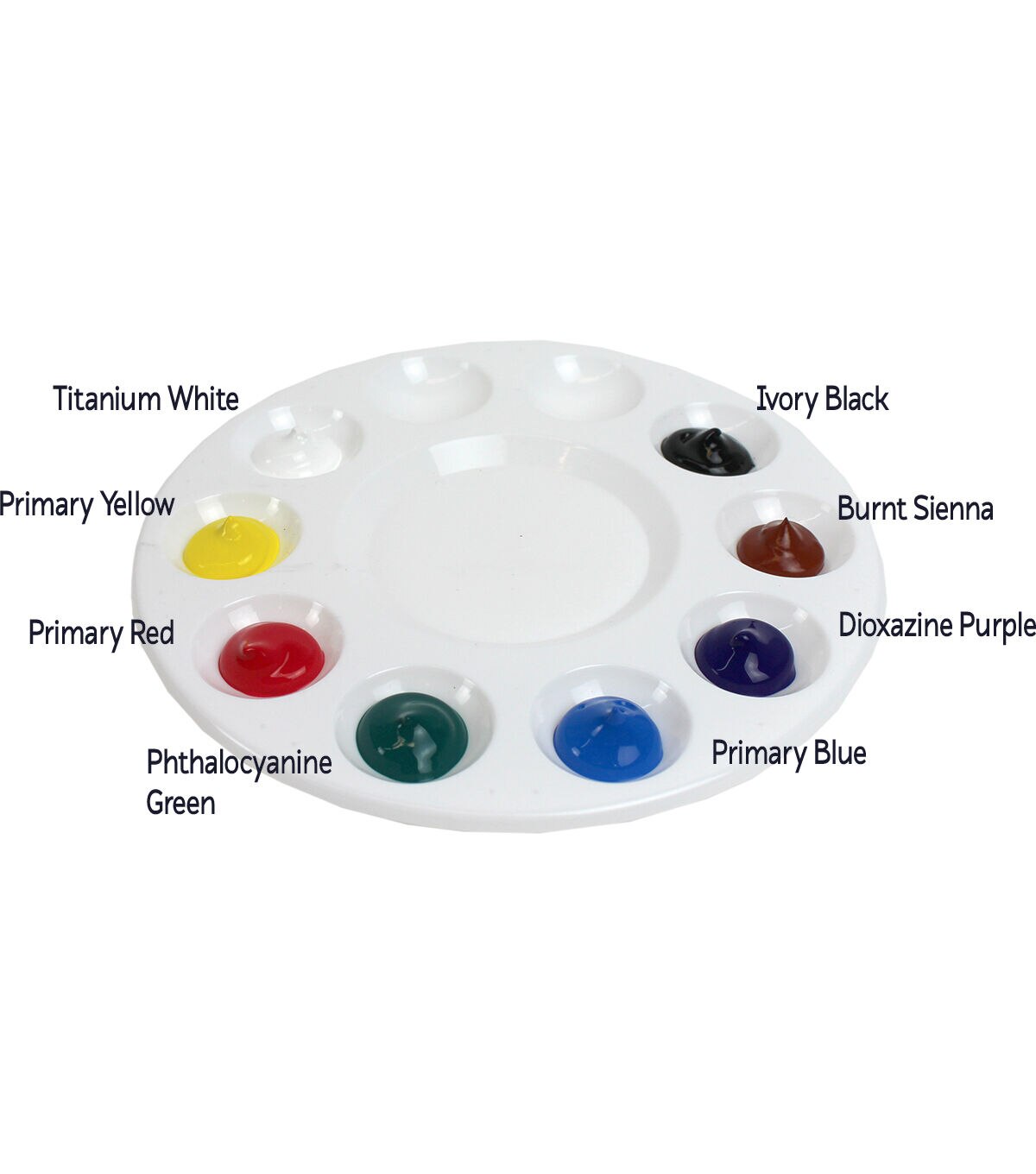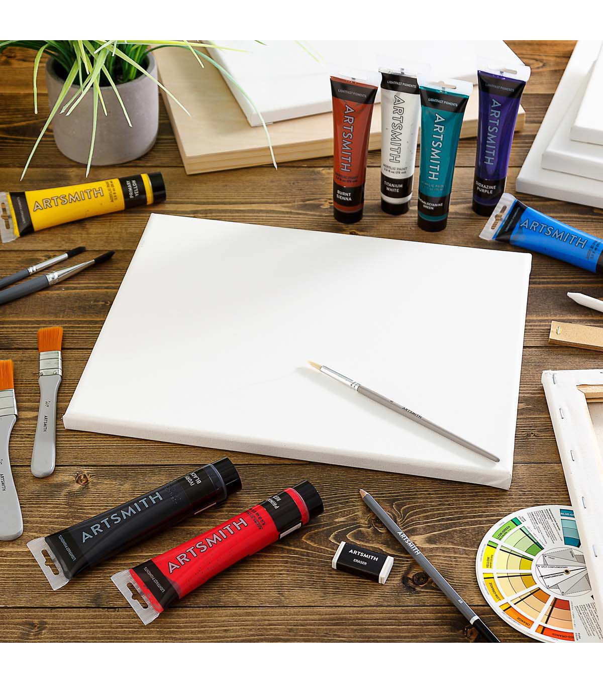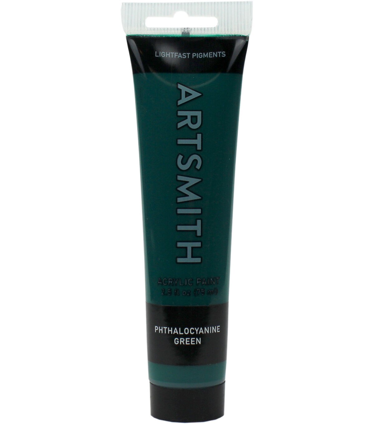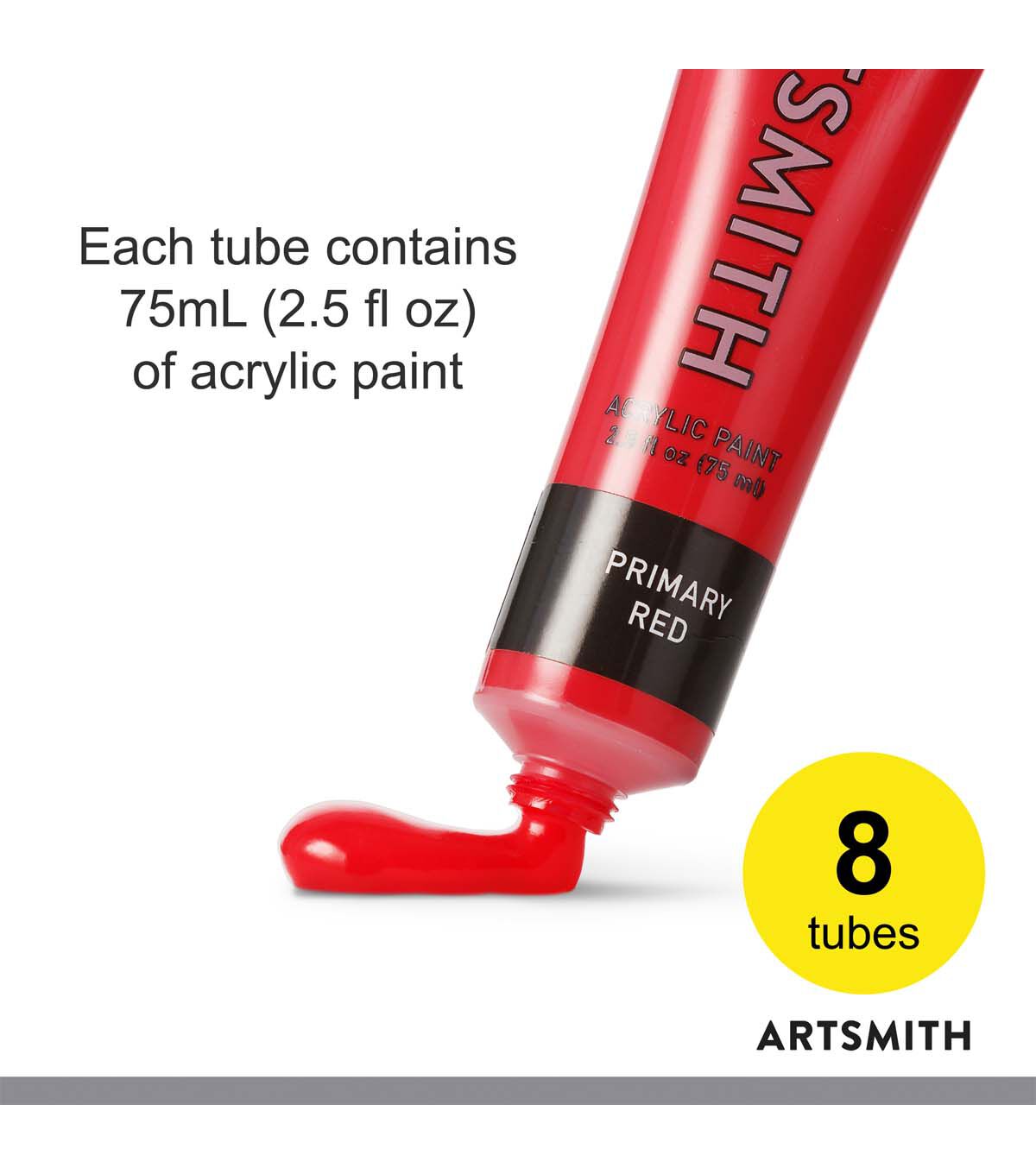Artsmith Acrylics are created for all artists. Made with lightfast, artist quality, pigments, these paints have bold, briliant color, a buttery consistency for easy mixing and blending, and dry to a low gloss, water resistant finish. Water based and AP non-toxic, use Artsmith Acrylics on surfaces such as paper, canvas and wood. Set contains 8 essential 75ml colors including 1 each of the following 75 ml tubes: Titanium White, Ivory Black, Primary Yellow, Primary Red, Phthalocyanine Green, Primary Blue, Dioxazine Purple, Burnt Sienna.