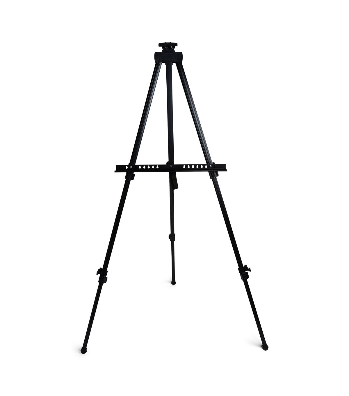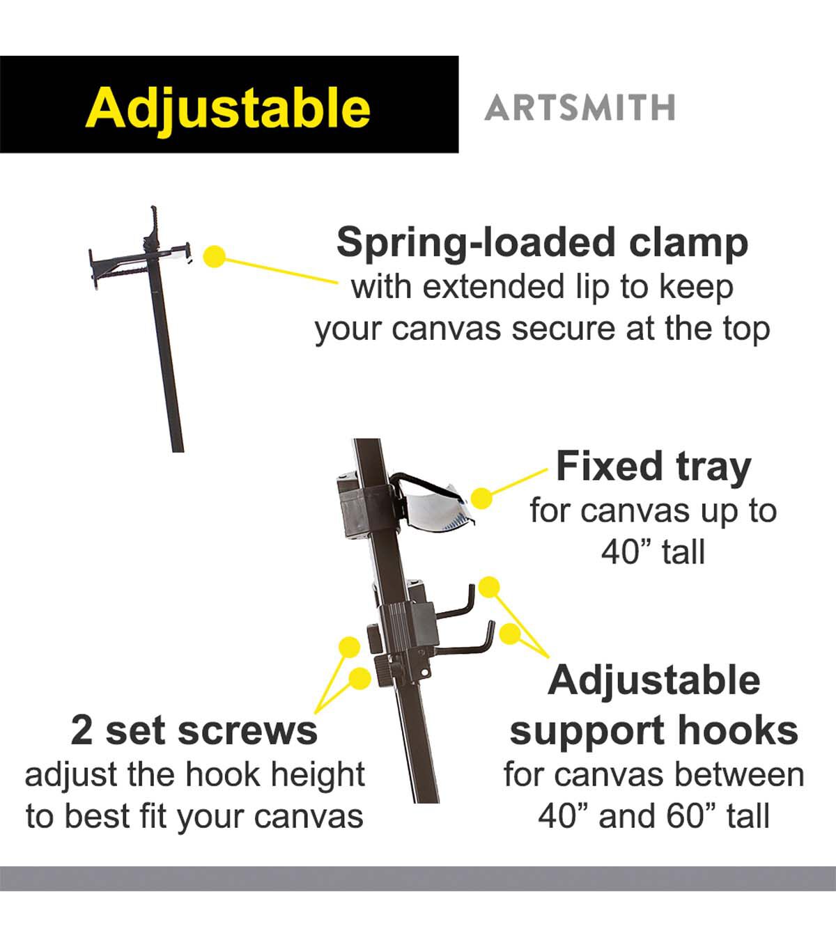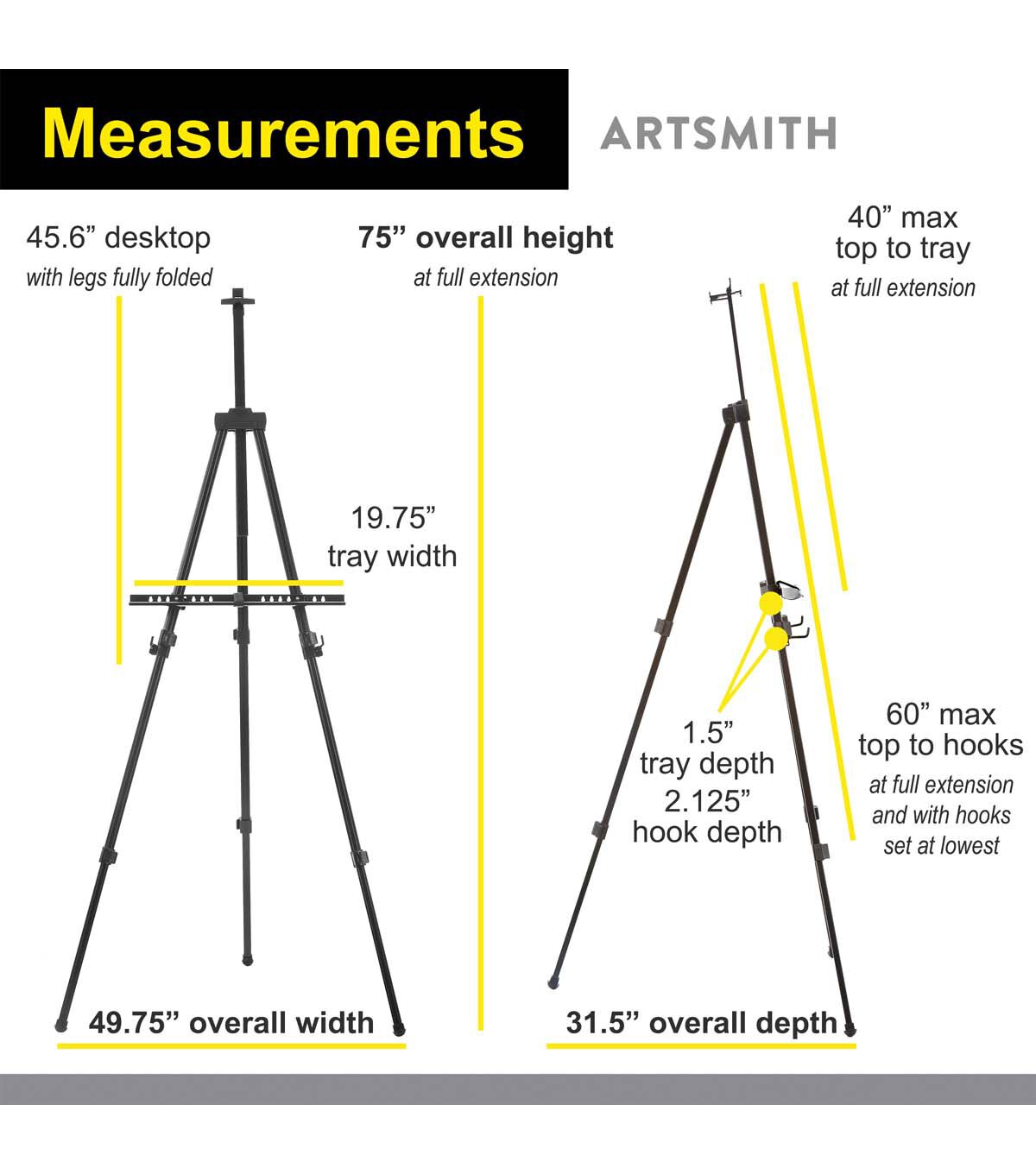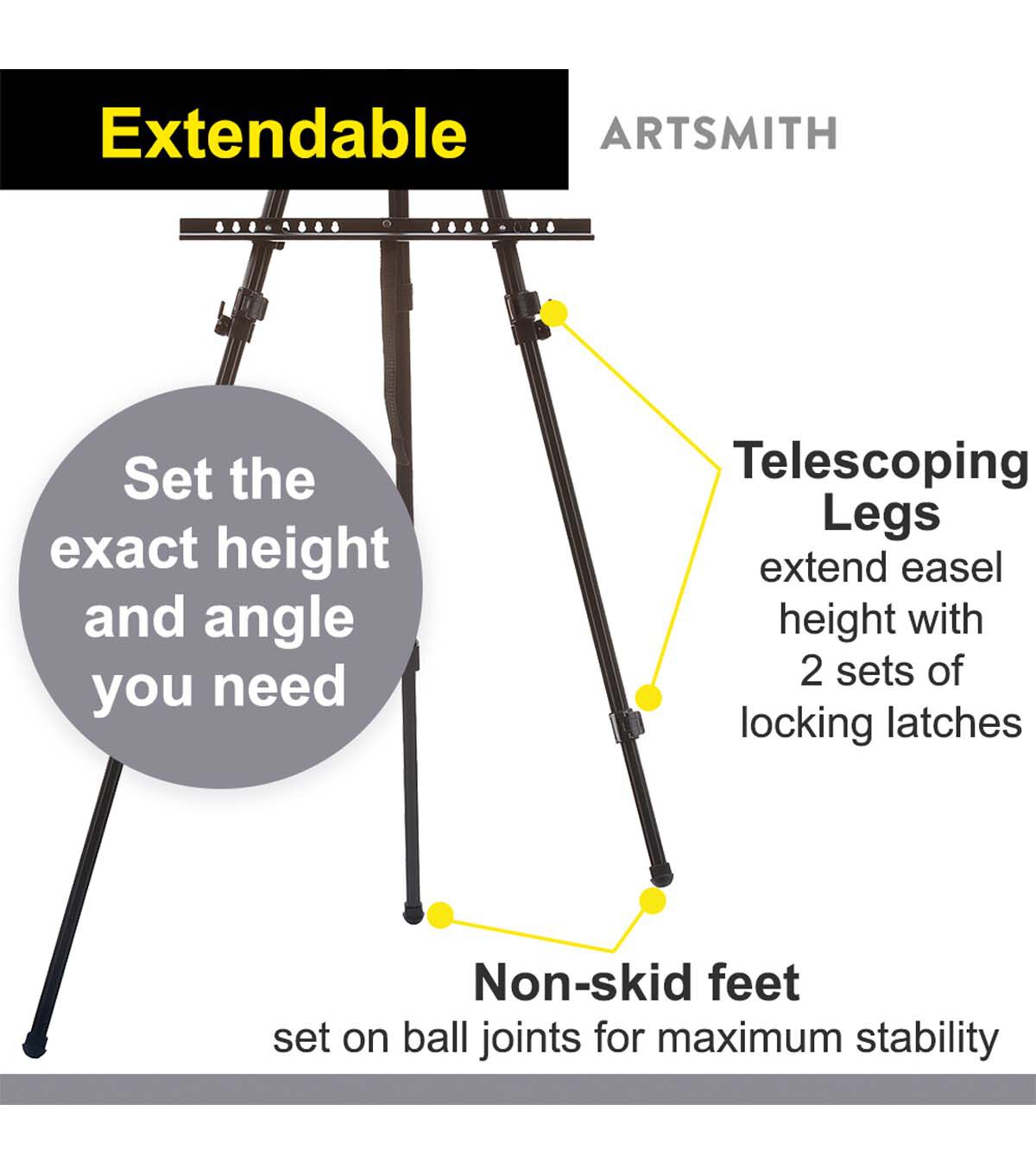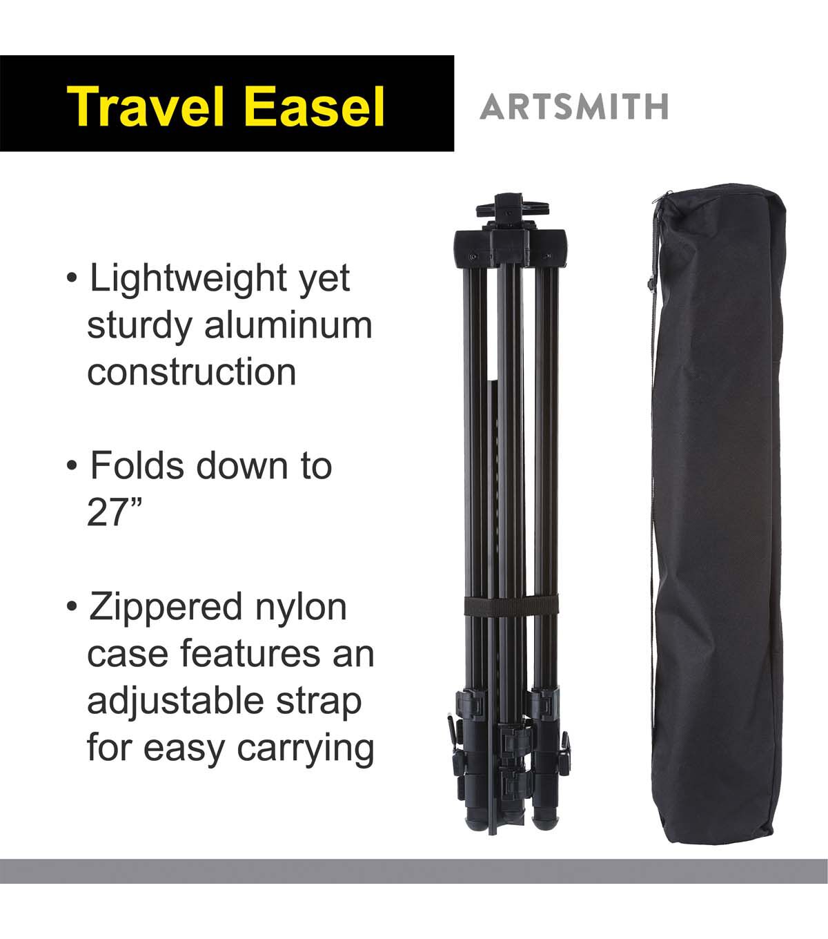 ARTSMITH professional travel easel 77in in balck Aluminum easel with with black nylon carrying case. Fit canvas sizes up to 60", Adjustable telescoping legs with non-skid rubber feet, Fully extended height of 77 in, folds down to 27in to fit inside the carrying case.