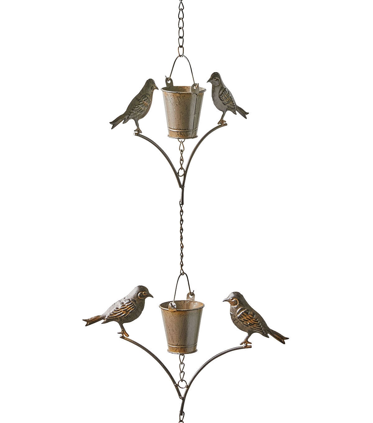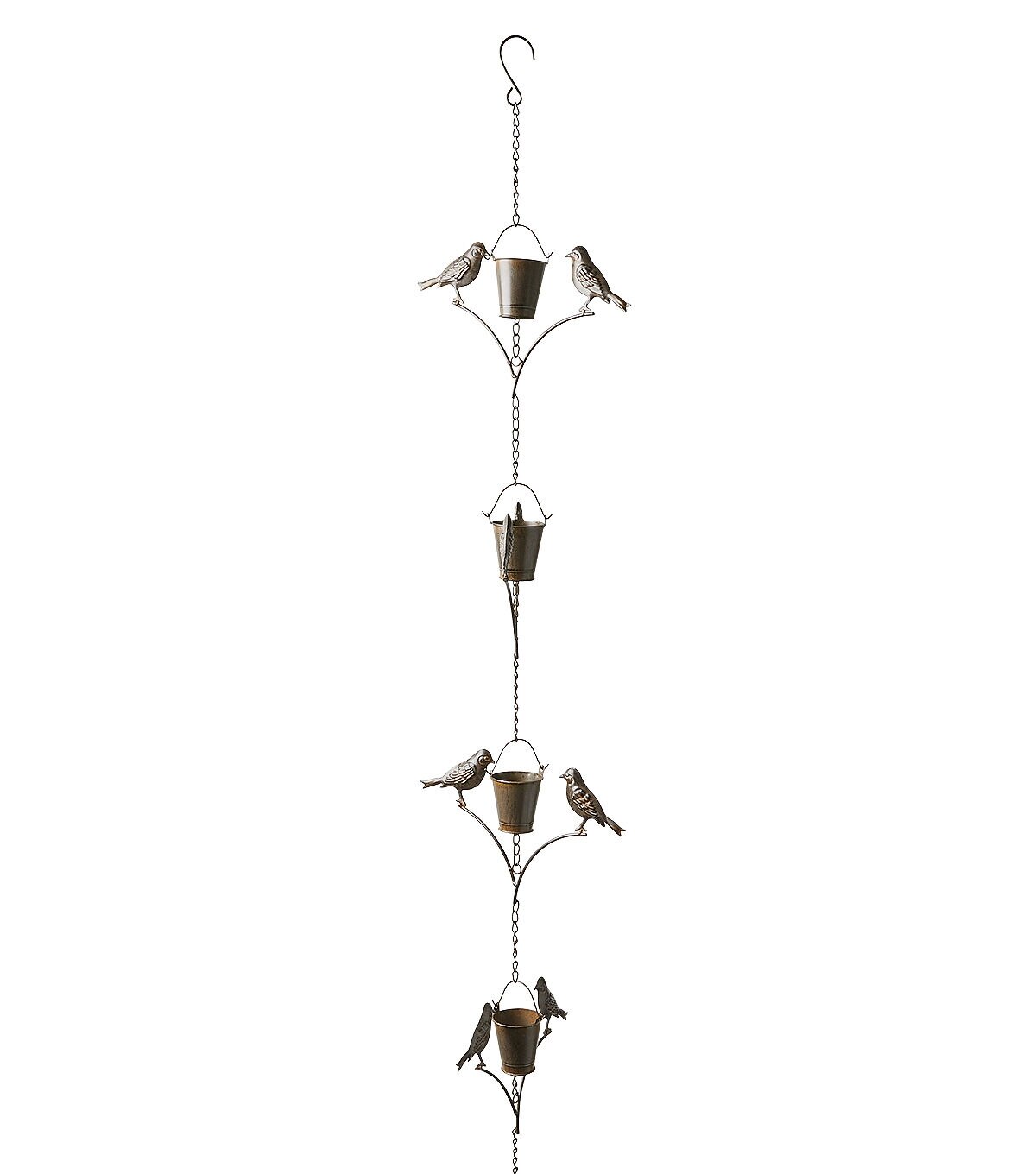Add the Spring Iron Bird & Pot Rain Gauge Windchime by Place & Time to your outdoor decor this spring season. This rain gauge wind chime is crafted with accents shaped like pots and birds attached to a link chain. It is made of iron and will be perfect to direct rainwater from the roof to the ground.