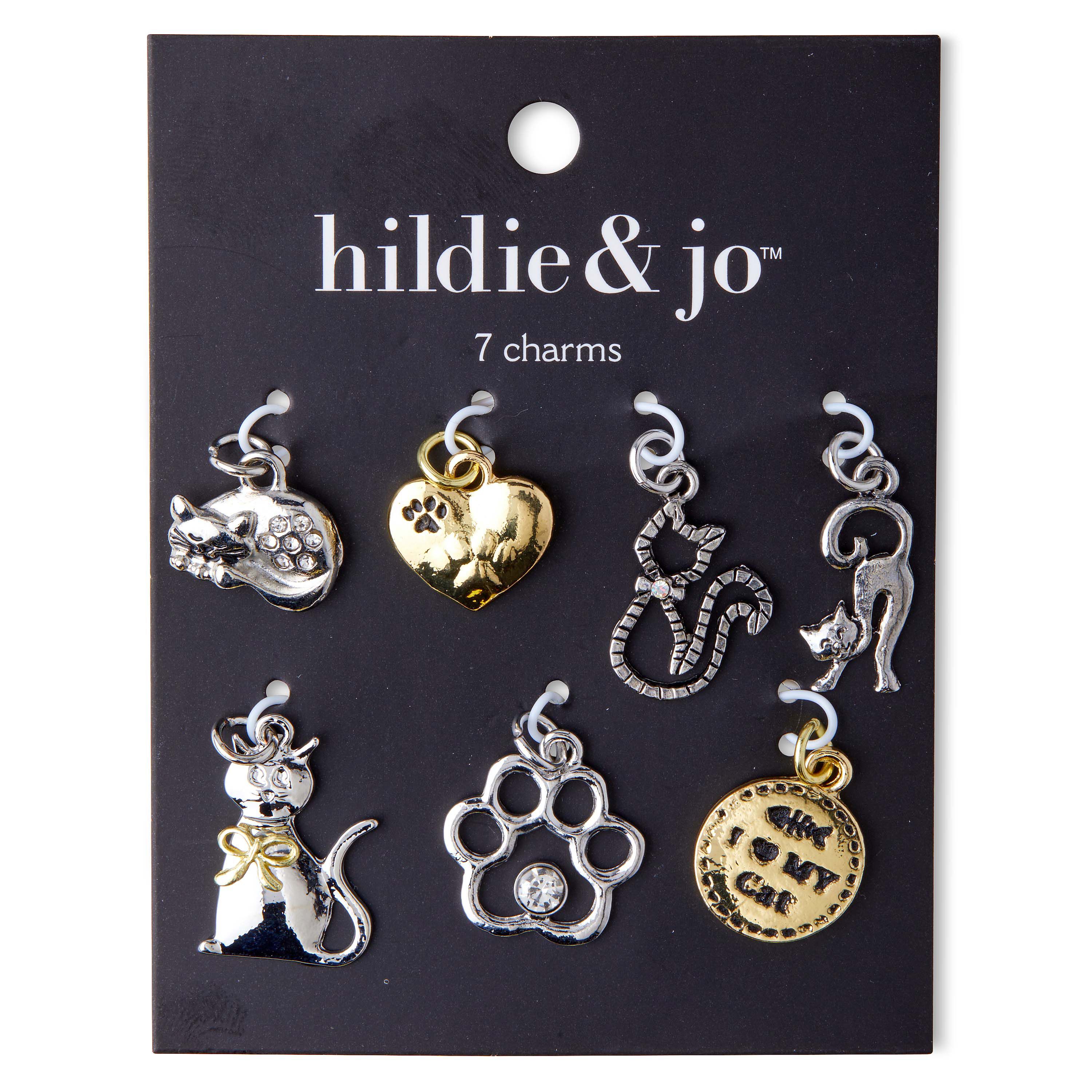 Use the hildie & jo Cat Charms-Silver & Gold in your next DIY project. This pack comes with seven unique charms. It includes a silver cat charm, laying down with a flower shape on the body in clear round crystals, a gold heart charm with a black and gold paw prints. Another charm has an outline of a silver cat wearing a bow tie. These charms comes with jump rings for easy attachment.