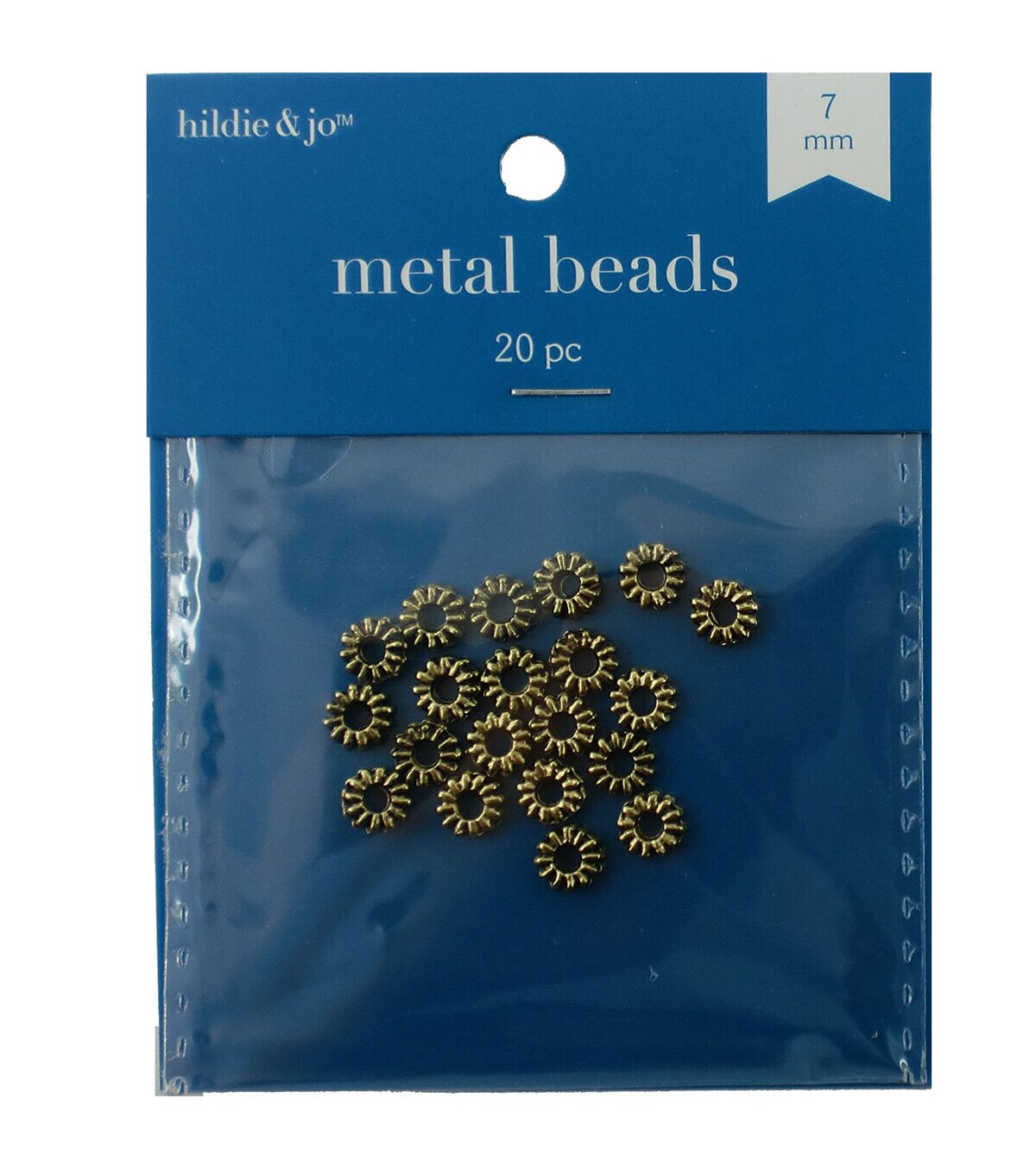 Explore your creative side with the hildie & jo Metal Wheel Beads - Gold. This pack contains 20 spacer beads made of metal alloy. They sport a gold-tones finish and a circular opening in the center with ridges along the edges. You can use them as connectors along with glass or metal beads to design statement bracelets, anklets, backpack charms, danglers and more.