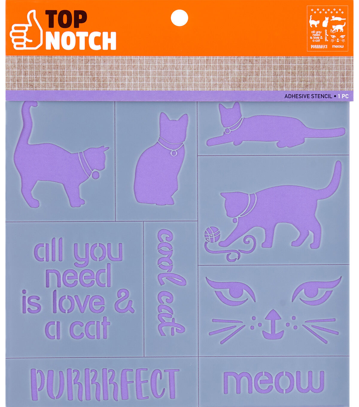 Attention all cat lovers! You are going to love the Top Notch Cats Stencil Sheet for all your crafts. This sheet of adhesive stencils features multiple cats in playful poses as well as fun cat phrases to complete your projects. Durable and reusable, these adhesive mylar stencil sheets are easy to clean up with mild soap and warm water. Once clean and dry, return stencil to backer sheet for storage. Your projects will look purrrffeect with the Top Notch Cats Stencil Sheet.