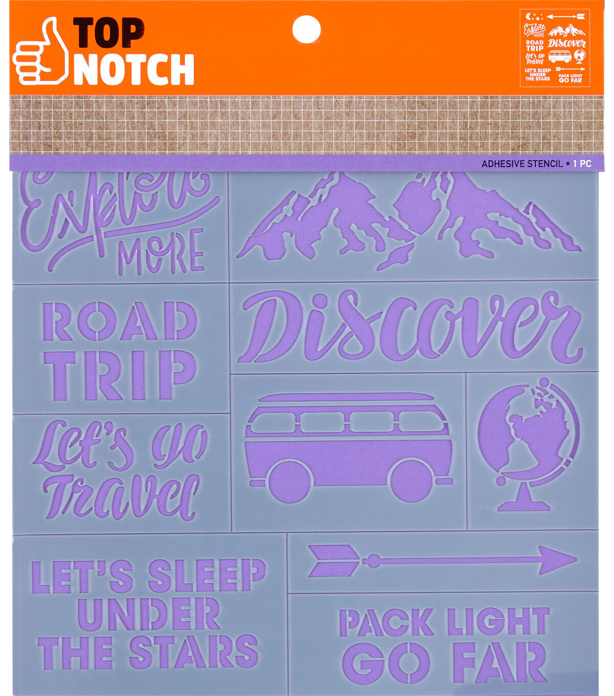Hit the open road for adventure with the Top Notch Wanderer Stencil Sheet. This adventurous sheet of stencils features words, phrases, and icons of travel! Durable and reusable, this adhesive mylar stencil sheet is easy to clean up with mild soap and warm water. Once clean and dry, return stencil to backer sheet for storage. Discover new places with the Top Notch Wanderer Stencil Sheet.