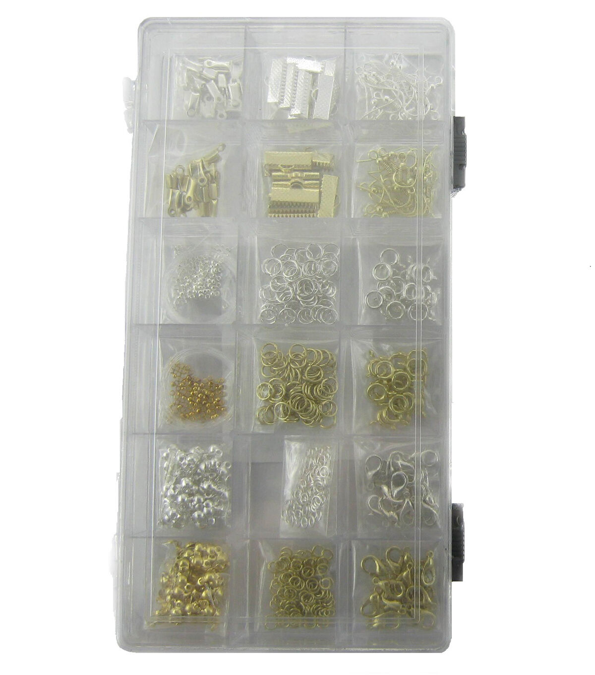 Find everything you need for jewelry making in the Jewelry Findings Kit-Gold & Silver. This findings kit includes multiple jewelry making staples in multiple colors. There are end beads, crimp beads, cord ends, jump rings in multiple sizes, cord ends, lobster clasps, spring rings ear wires and wire. They come in a handy plastic case, where all items are divided.