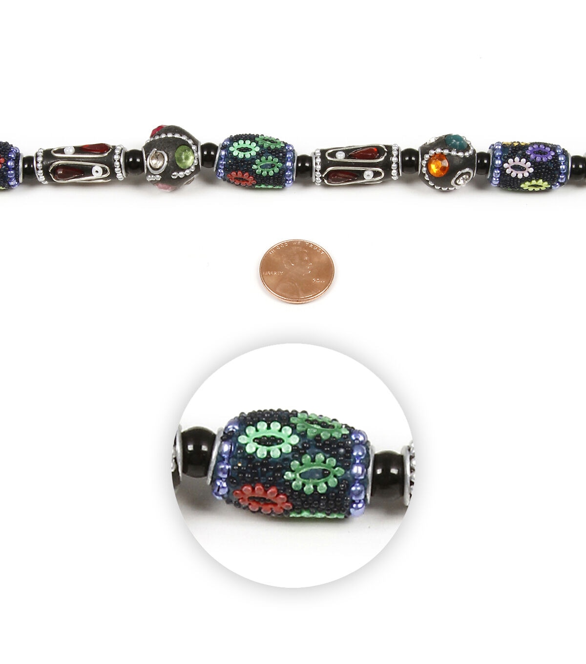 The hildie & jo Inlay Clay Beads - Multi will be a great gift for a beading enthusiast in your life. These eye-catching black and gray clay beads are inlaid with sparkling silver and colorfully painted accents. They will be fun to combine with other beads and chains to create unique bracelets, neckpieces, earrings, bag charms and more. The beads come in three sizes.