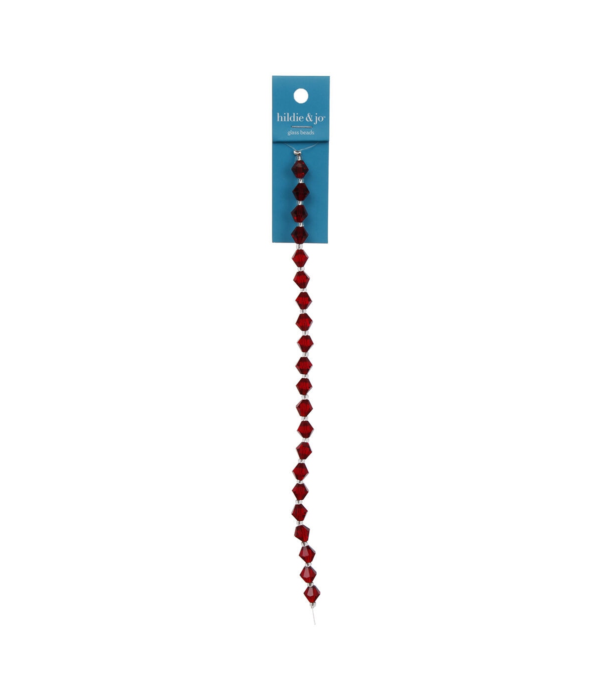 Add a pop of color to your jewelry designs using the hildie & jo Bicone Glass Strung Beads - Ruby. These beads sport a lovely ruby hue. Clear spacer beads are also included in this strand. Team them with stretch cords to make bracelets. You can also add them to nylon cords or tigertail wires or use them as connectors in your creations.