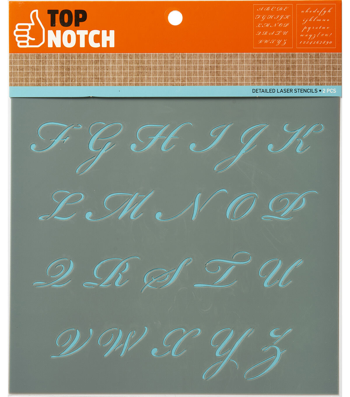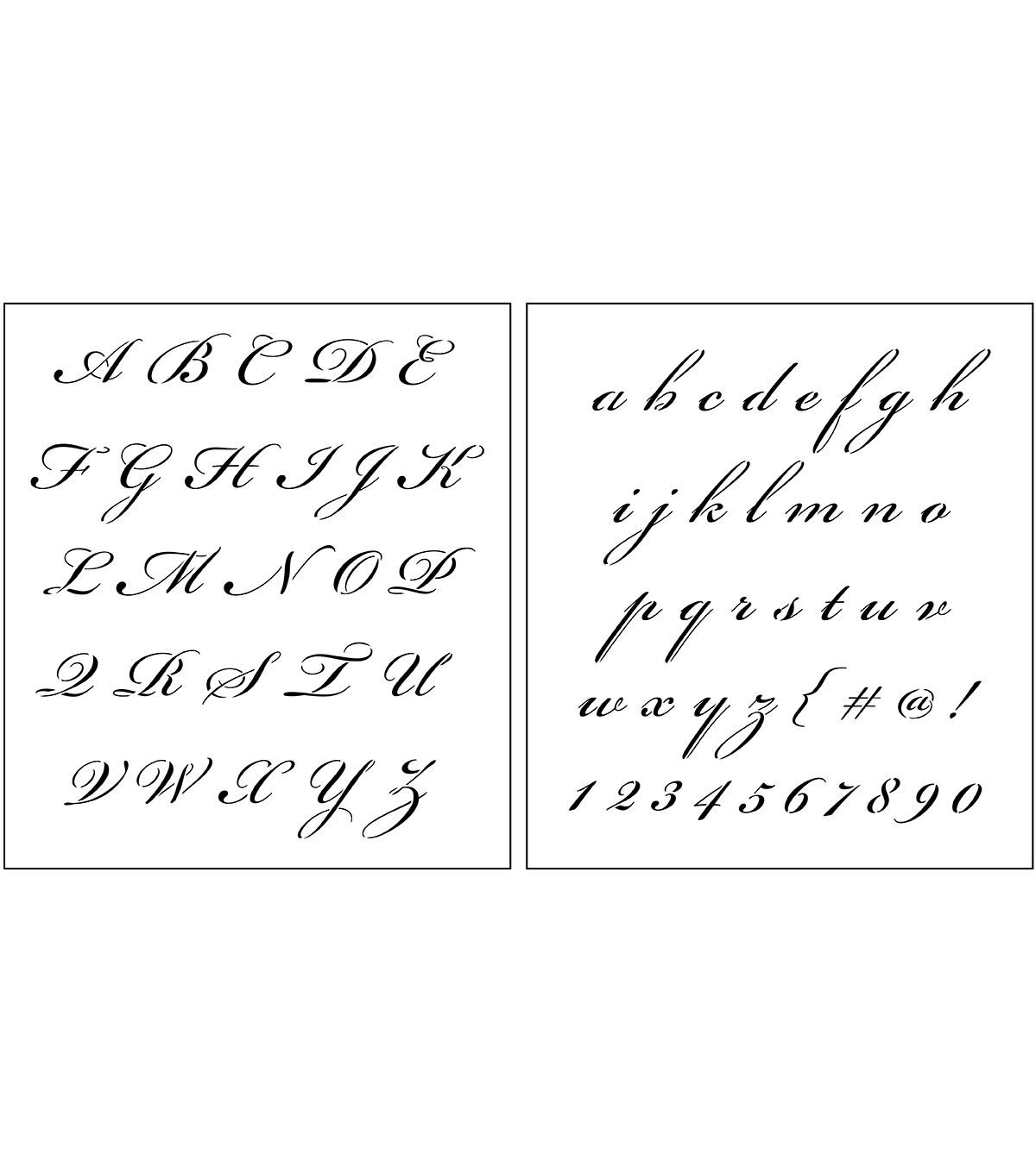 Create beautiful and elegant words and phrases with the Top Notch Elegant Script Alphabet Stencil Pack. This pack of cursive letters will give your projects a classic and sophisticated look. Durable and reusable, these mylar stencil sheets are easy to clean up with mild soap and warm water. Add the Top Notch Elegant Script Alphabet Stencil Pack to your stencil collection for an added elegant option to your crafting.Create beautiful and elegant words and phrases with the Top Notch Elegant Script Alphabet Stencil Pack. This pack of cursive letters will give your projects a classic and sophisticated look. Durable and reusable, these mylar stencil sheets are easy to clean up with mild soap and warm water. Add the Top Notch Elegant Script Alphabet Stencil Pack to your stencil collection for an added elegant option to your crafting.