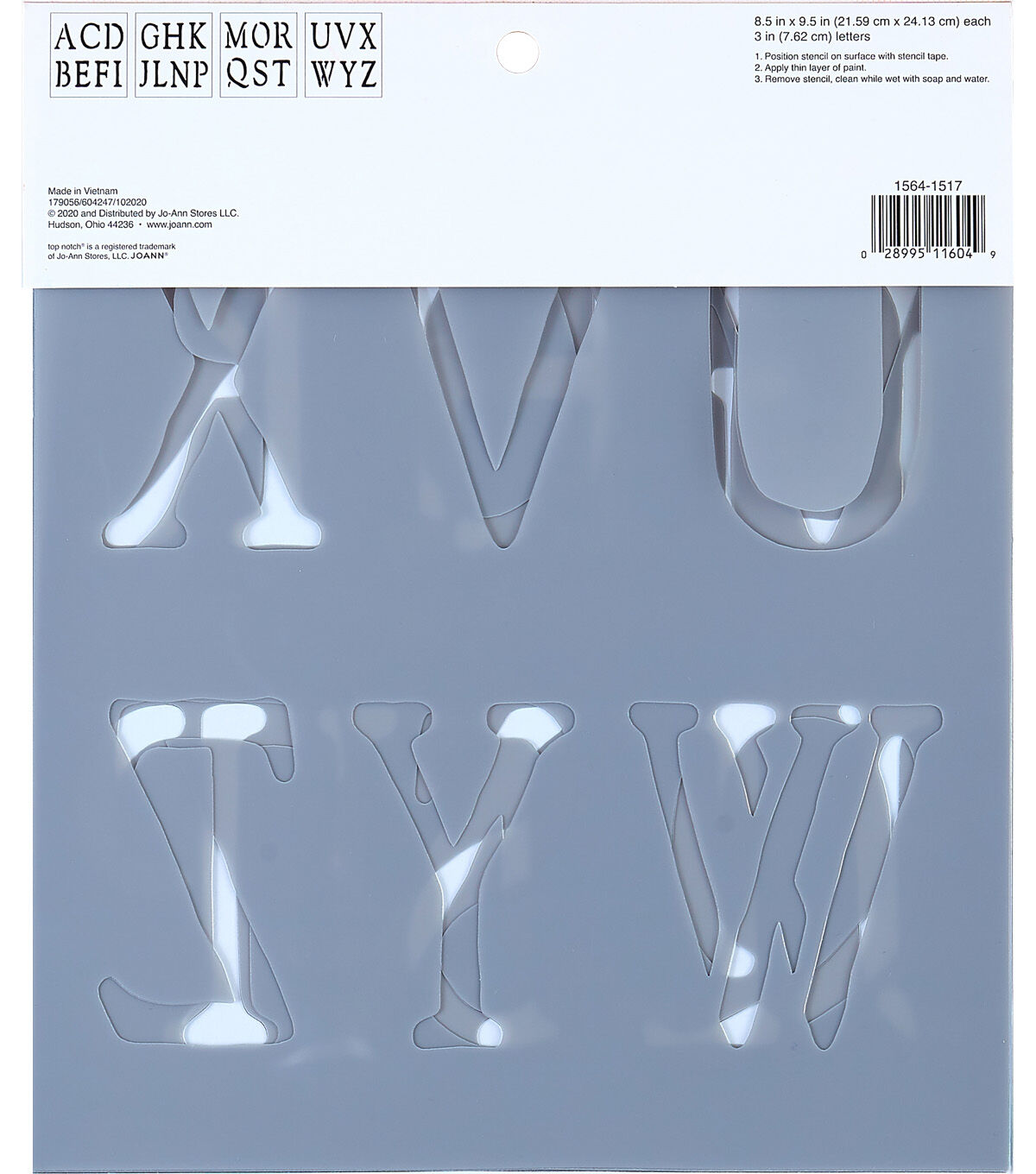 - Stencil Size: 8.5" x 9.5" Letter Size: 3" tall