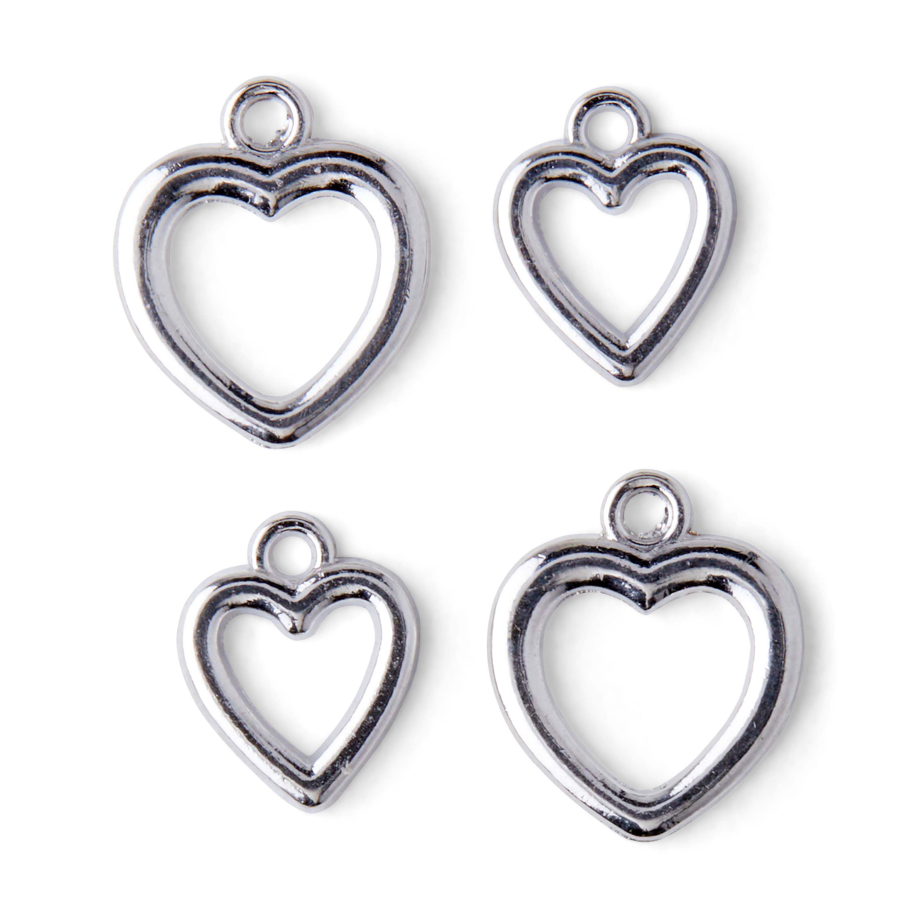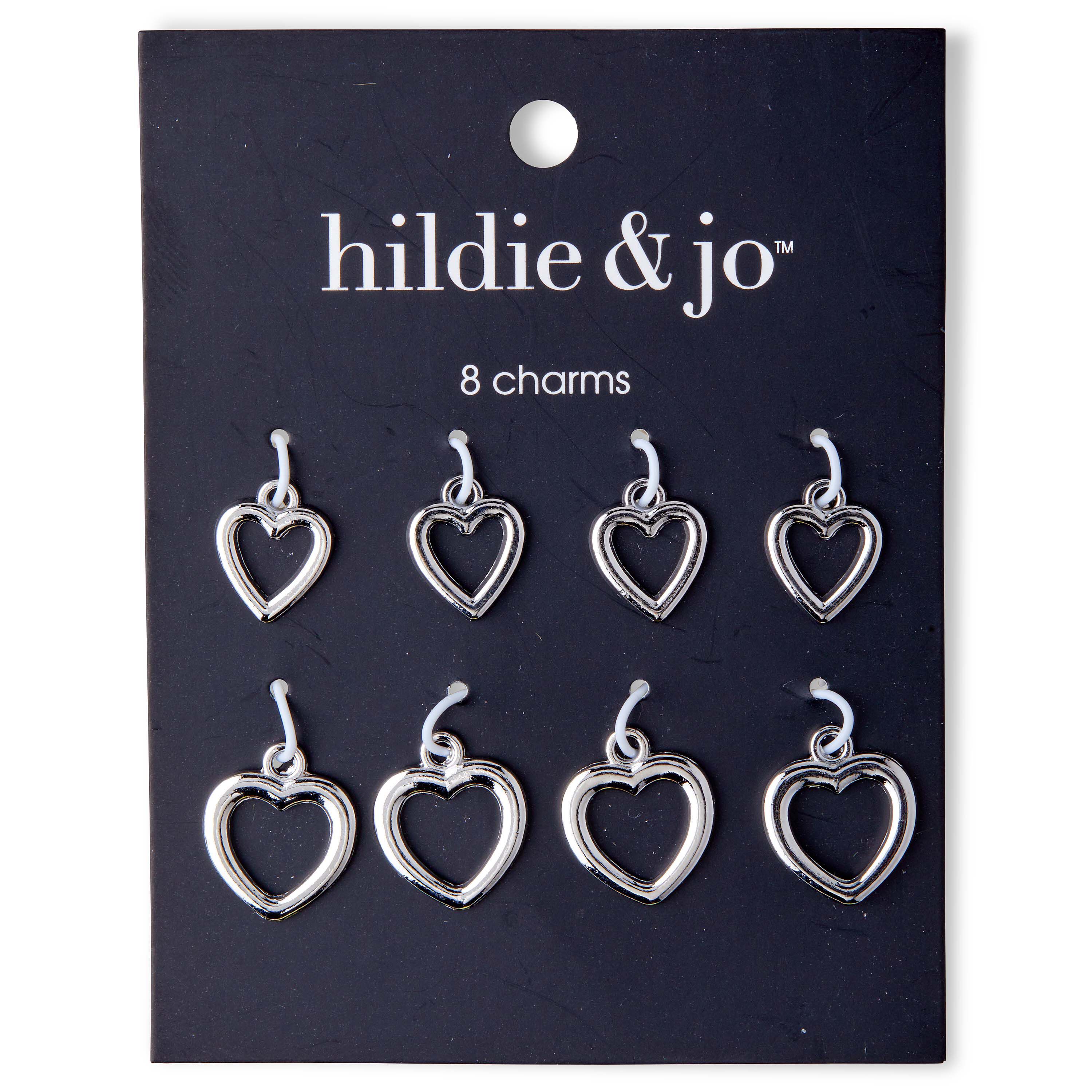 Dang these little hildie & jo Symbolize Heart Silver Charms on your bracelets, necklaces, keychains and more for visual flair. Minimalist and adorable, these charms feature a smooth silver finish with an open center. You can use these charms to accessorize decor and craft projects as well. This pack contains eight assorted heart charms.